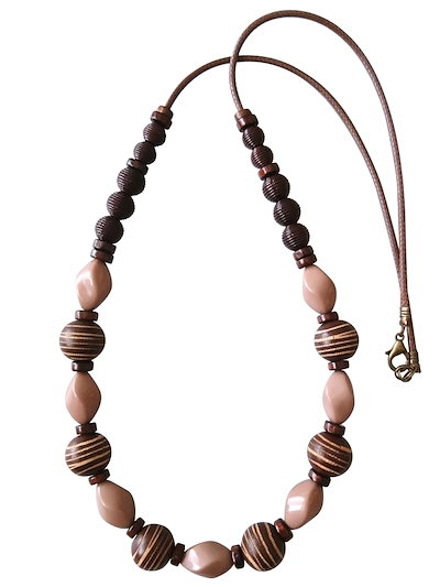 flower storm【ワックスコードネックレス】長さ約70cm 小粋な縞柄ウッド&艶アクリルビーズのロングネックレス ブラウン 縞柄球形(アクセサリー 木製 樹脂 横縞模様 和 日本製)