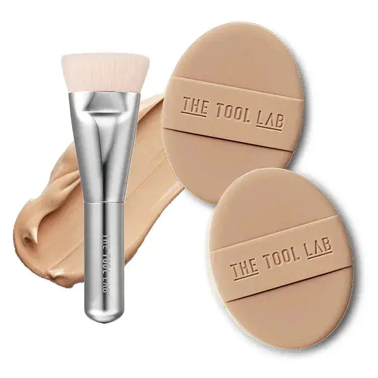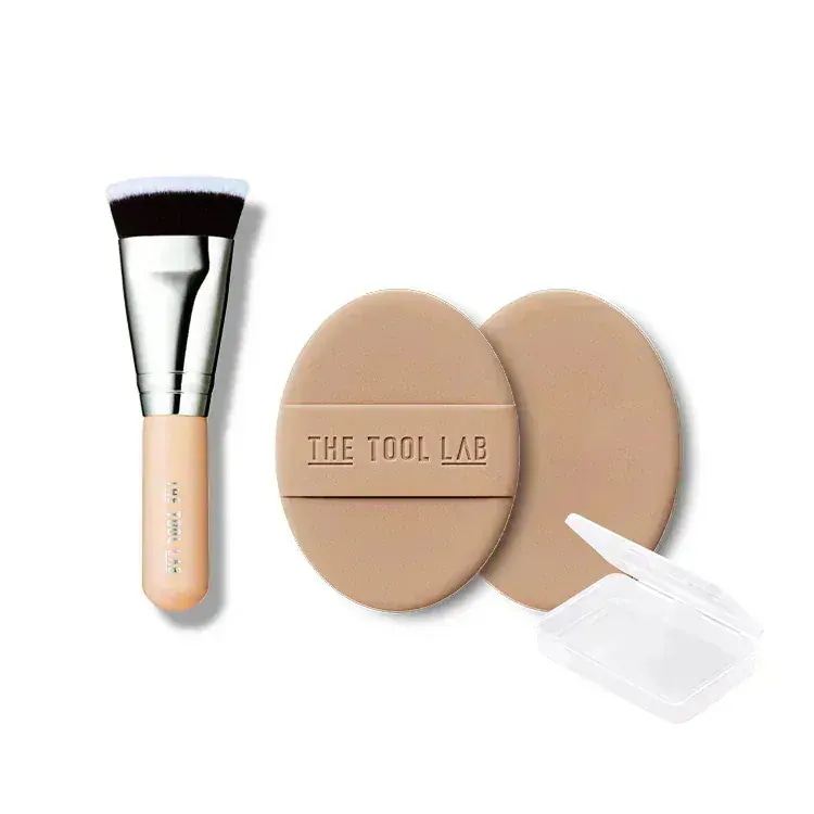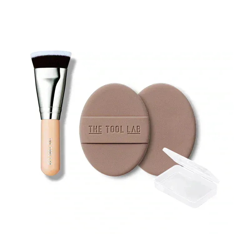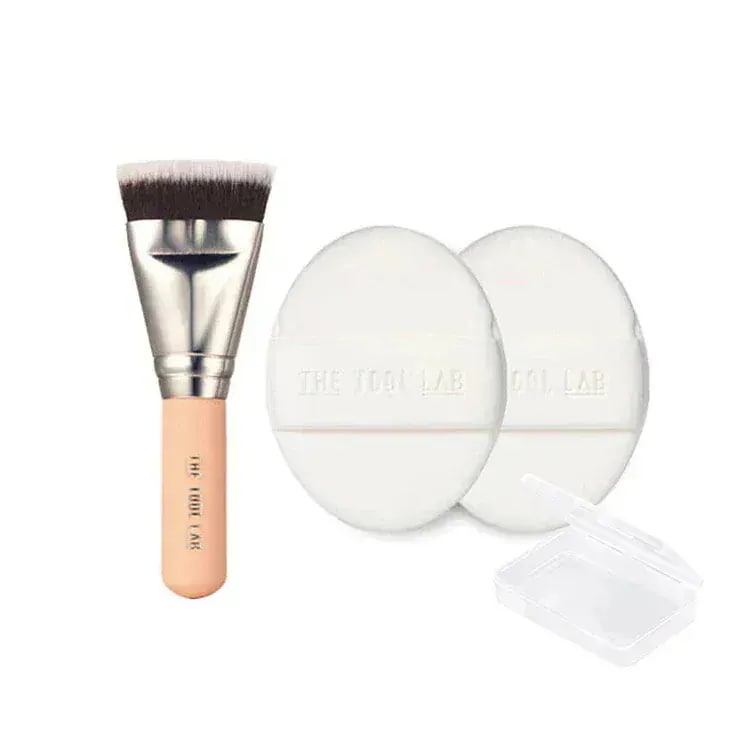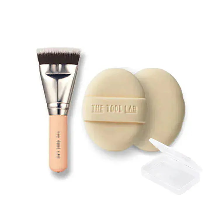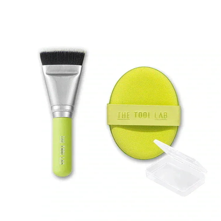 スポンジでこんなに仕上がりが変わるんだなぁ…と感動しました!グリーンの方は筆付きで付属のケースで持ち運べるので便利です。この筆の長さが絶妙で均一にファンデをのばすことができて、とにかく使いやすいです。のばしたファンデをスポンジで馴染ませるとキレイなベースが仕上がります。