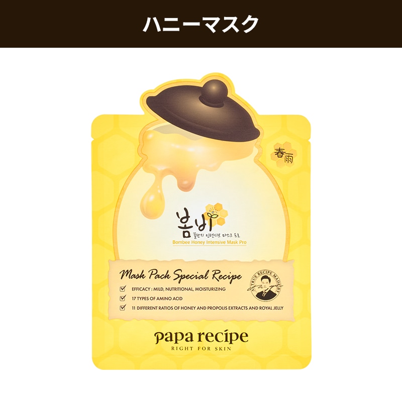 Qoo10のサンプルマーケットで無償でいただきました✨ありがとうございます😭パパレシピのシートマスク初めて使用しました開けた瞬間からハチミツのいい匂い…🍯プーさんも納得の大興奮だと思う🐝ハチミツ大好きなので、パックをつけると顔面にハチミツ塗りつけてるみたいで幸せ…💛シートは液がとにかくヒタヒタでパックを貼って放置しても乾燥とか一切気にならない❣️ずっとヒタヒタのまま!はちみつだから、シートもややぬるっとしてる剥がした後もお肌の水分が保たれてるけど、さっぱりしてますパックの中に残った化粧水も顔に十分ぬれる!!!結構好きなパックだった🌼