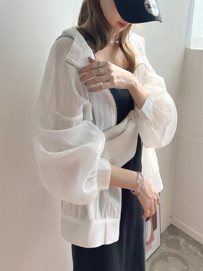 腕を伸ばすと手首5cmほど見えるくらいの短さです。手の甲もやけたくないという人にはおすすめしません。丈は腰あたりです。とっても薄くて夏らしいです!