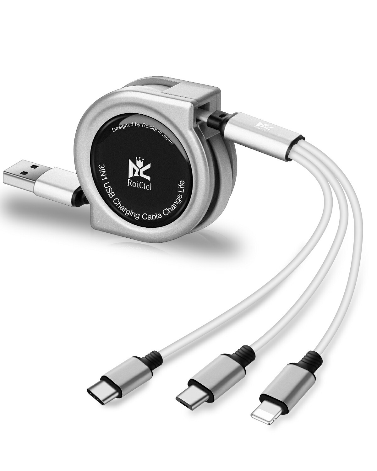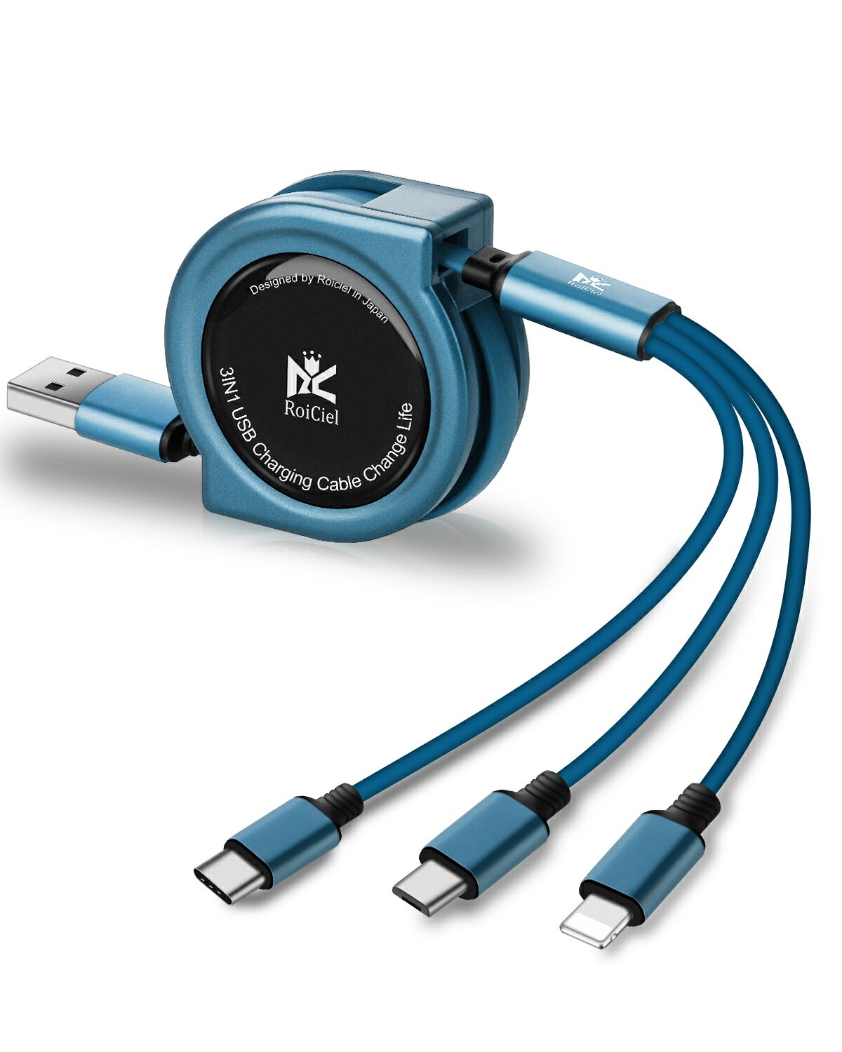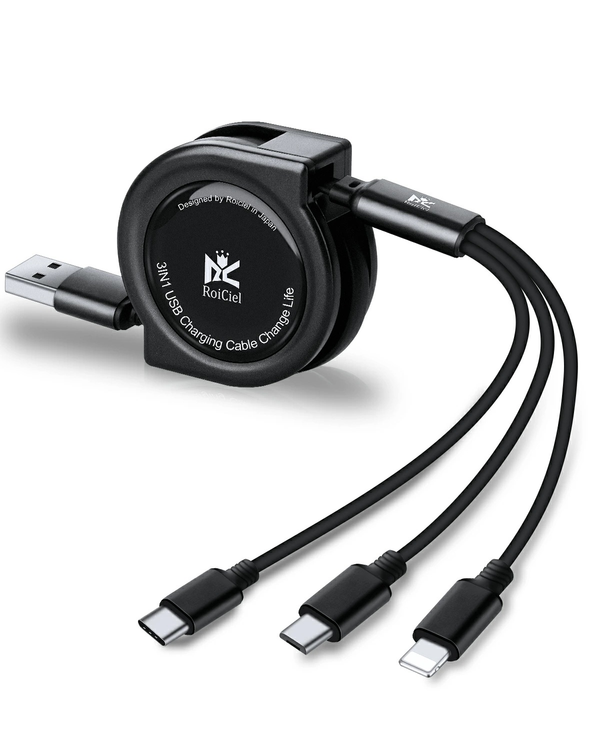 2本目半額クーポン配布中 RoiCiel 3in1 USB充電ケーブル 巻き取り ライトニング/USB Type-C/マイクロUSBケーブル 1本3役 両面挿し