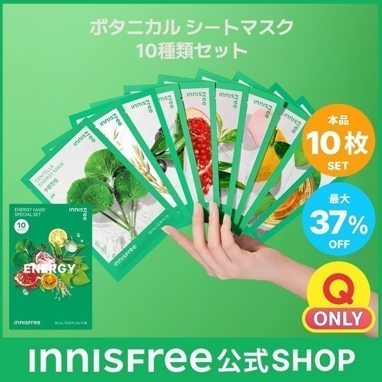 リピ購入。メガ割でもすぐ届いたので嬉しいです。10種類入ったパックセットは気分や肌調子に合わせて使えるので、飽きなくて(笑)好きです。美容液たっぷりで、余った液も首、腕、脚に塗っています。イニスフリーさんは毎回サンプルをたくさん入れて下さるのも嬉しいですね。