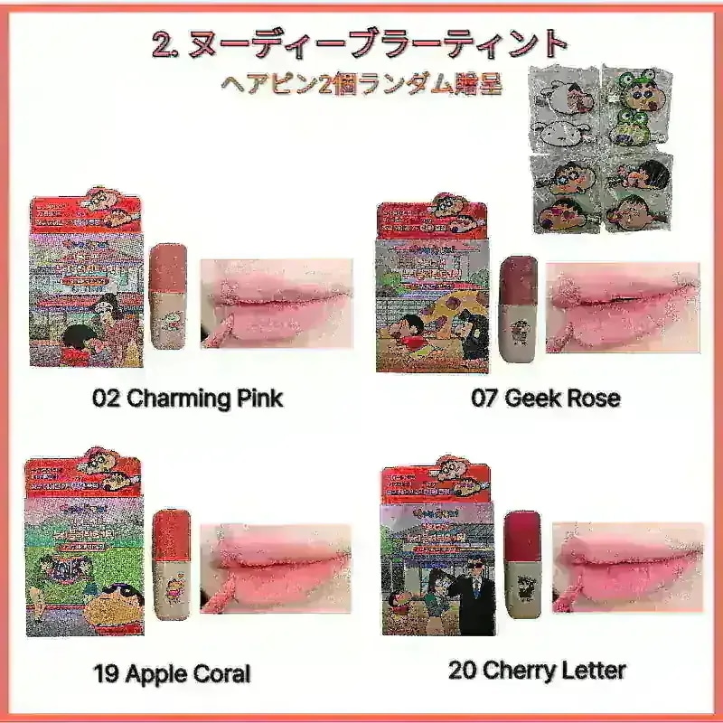 発色自体はかなり薄づきかも?!!!自分はファンデとかコンシーラーで唇の血色を消して、その上から塗るのが結構おすすめ♡自分が買った色は青みピンク寄りだからブルベさん向けかな?とにかく可愛いのと、しんちゃん好きは絶対買って損ない💕💕