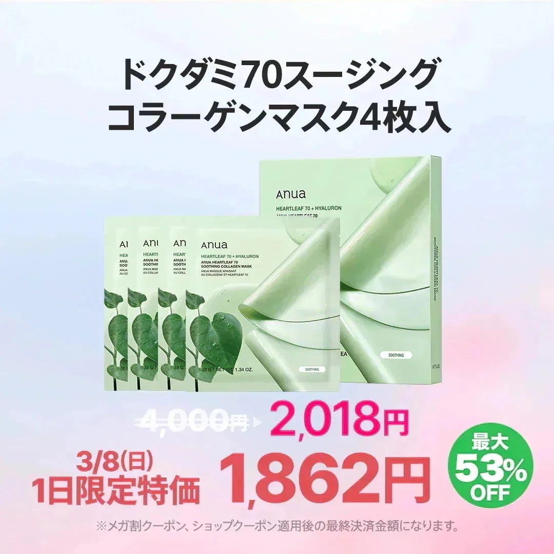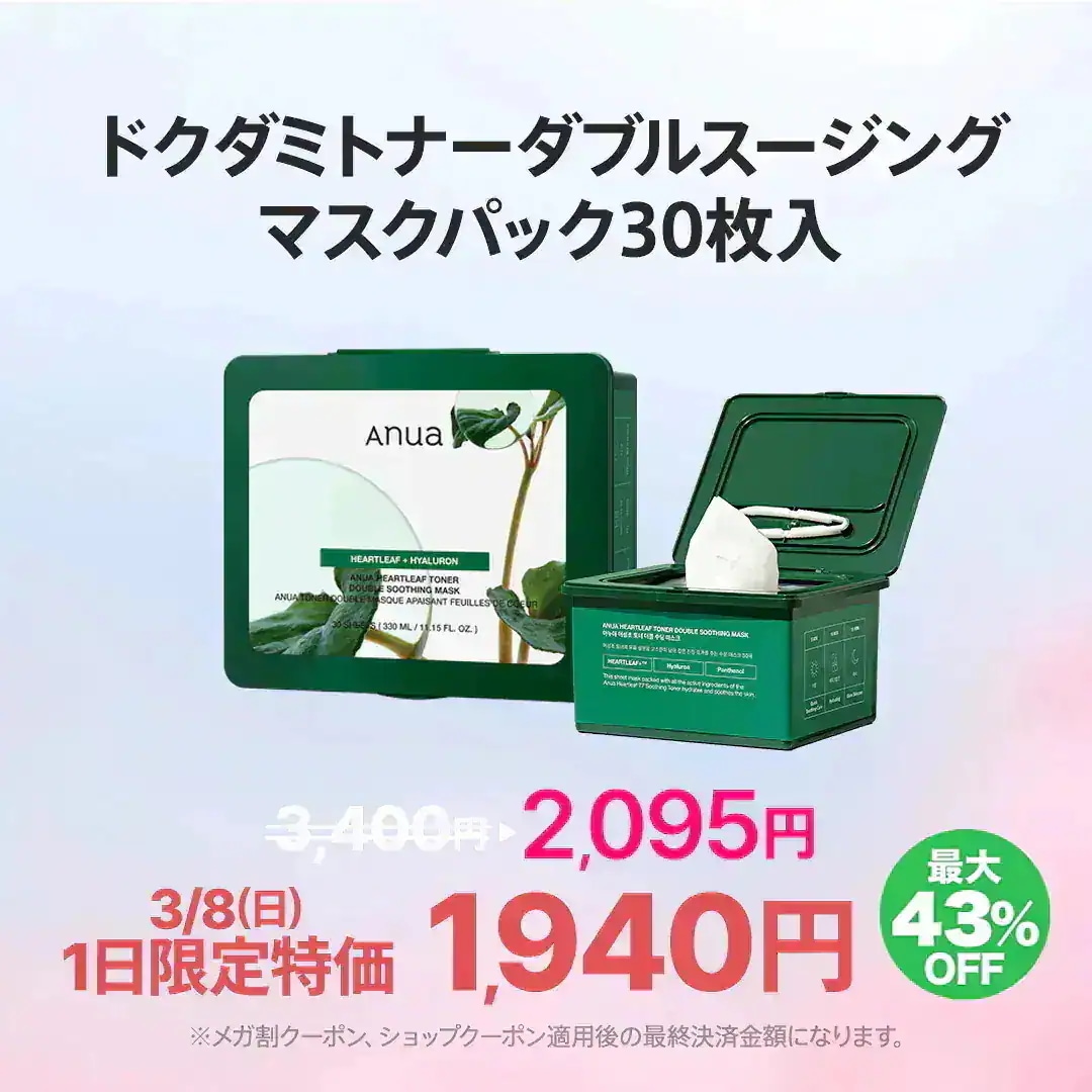 5 5toc*** 2026.02.14 選択:ドクダミトナーダブルスージングマスクパック30枚入り(+100円)オプション : 選択:ドクダミトナーダブルスージングマスクパック30枚入り(+100円) 肌タイプ : 混合肌 肌トーン : イエベ 肌の悩み : 毛穴, 乾燥