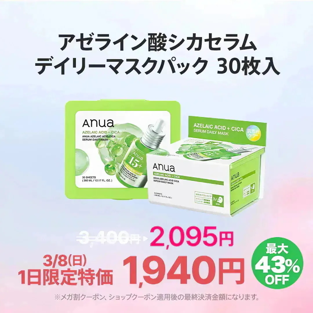 5 5fl.*** 2026.02.10 選択:アゼライン酸シカセラムデイリーマスクパック30枚入り(+100円)オプション : 選択:アゼライン酸シカセラムデイリーマスクパック30枚入り(+100円) 肌タイプ : 混合肌 肌トーン : ブルベ 肌の悩み : ニキビ・肌荒れ, 毛穴