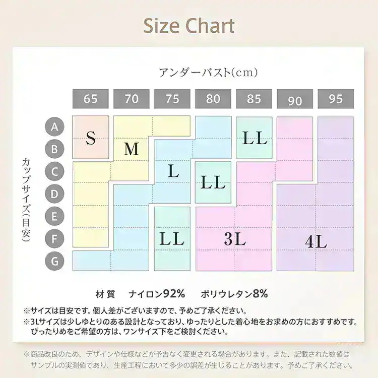 GよりのFカップ70で、L買いました。脇から胸が出ますが、いっこあげるとアンダーがゆるくなるんだろーな〜 背中が高くて安定感はあるけど バストの重みに対して肩幅がが少し狭い。パッドも少し厚い。安いから仕方ない…