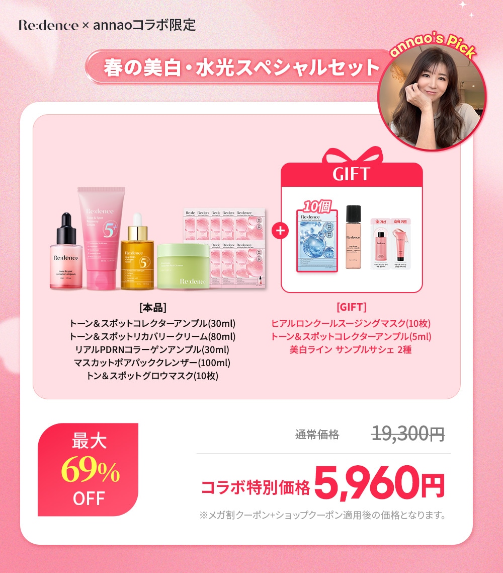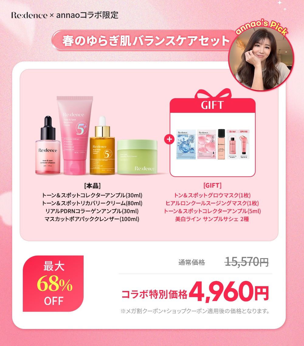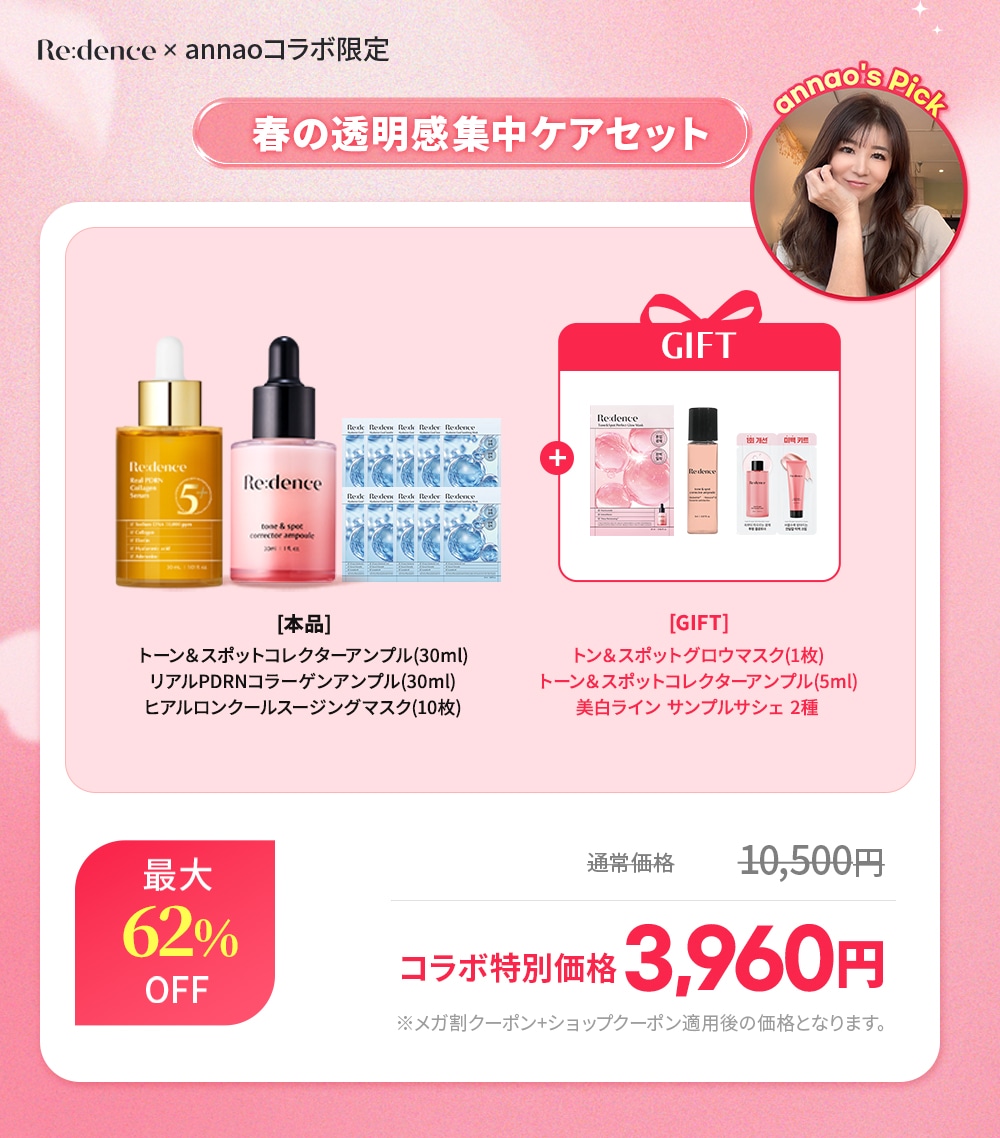 いつも使用しているPDRNが無くなりそうだな~と思っている時に、シミケアも出来る美容液とセットになっていてお得じゃん!と思い購入しました。ゴールドのPDRNは使用感も良くてハリが出そうです。ピンクのシミケアもとろっとしたテクスチャーで保湿もされそうです。効果はまだ分かりませんが続けてみます。