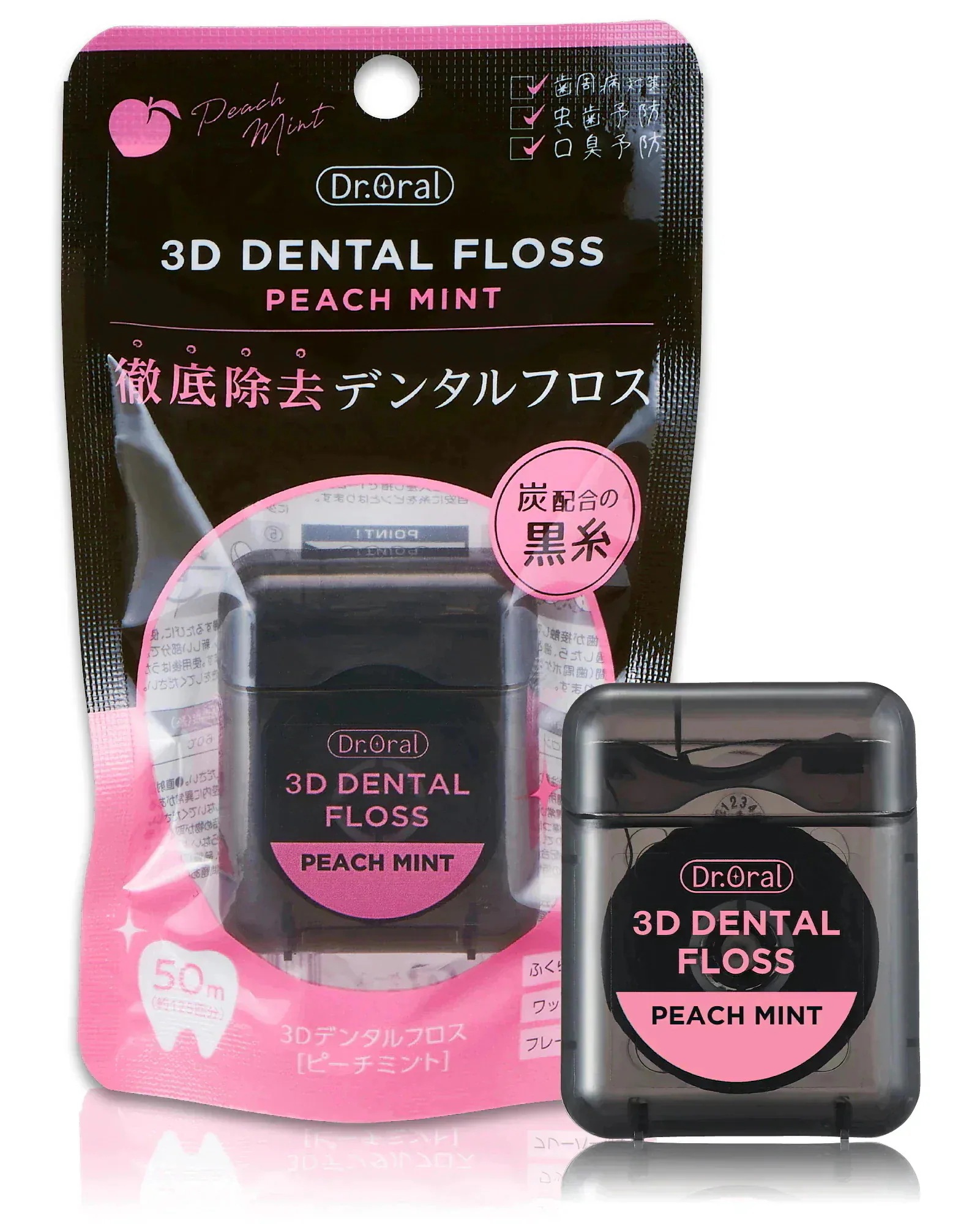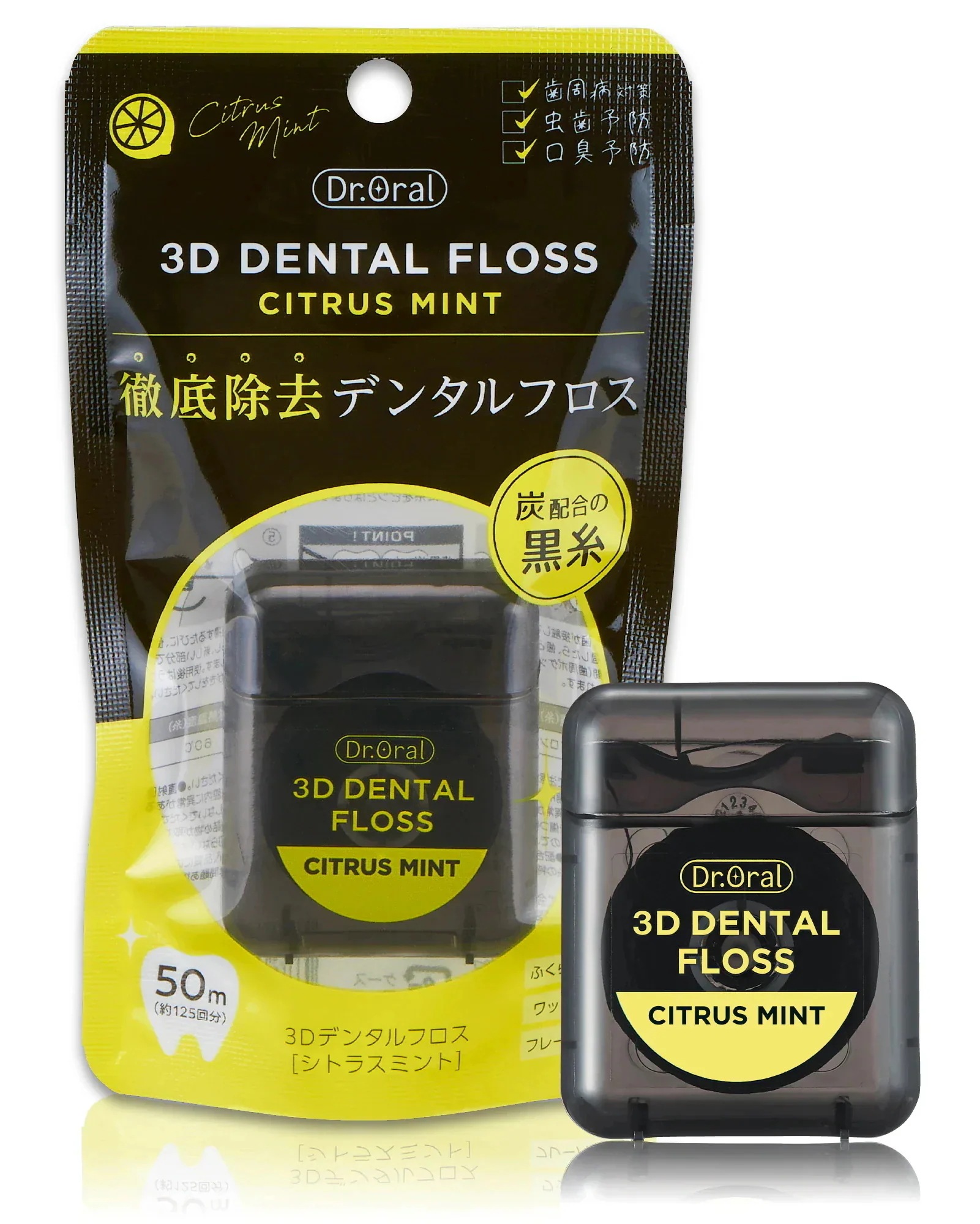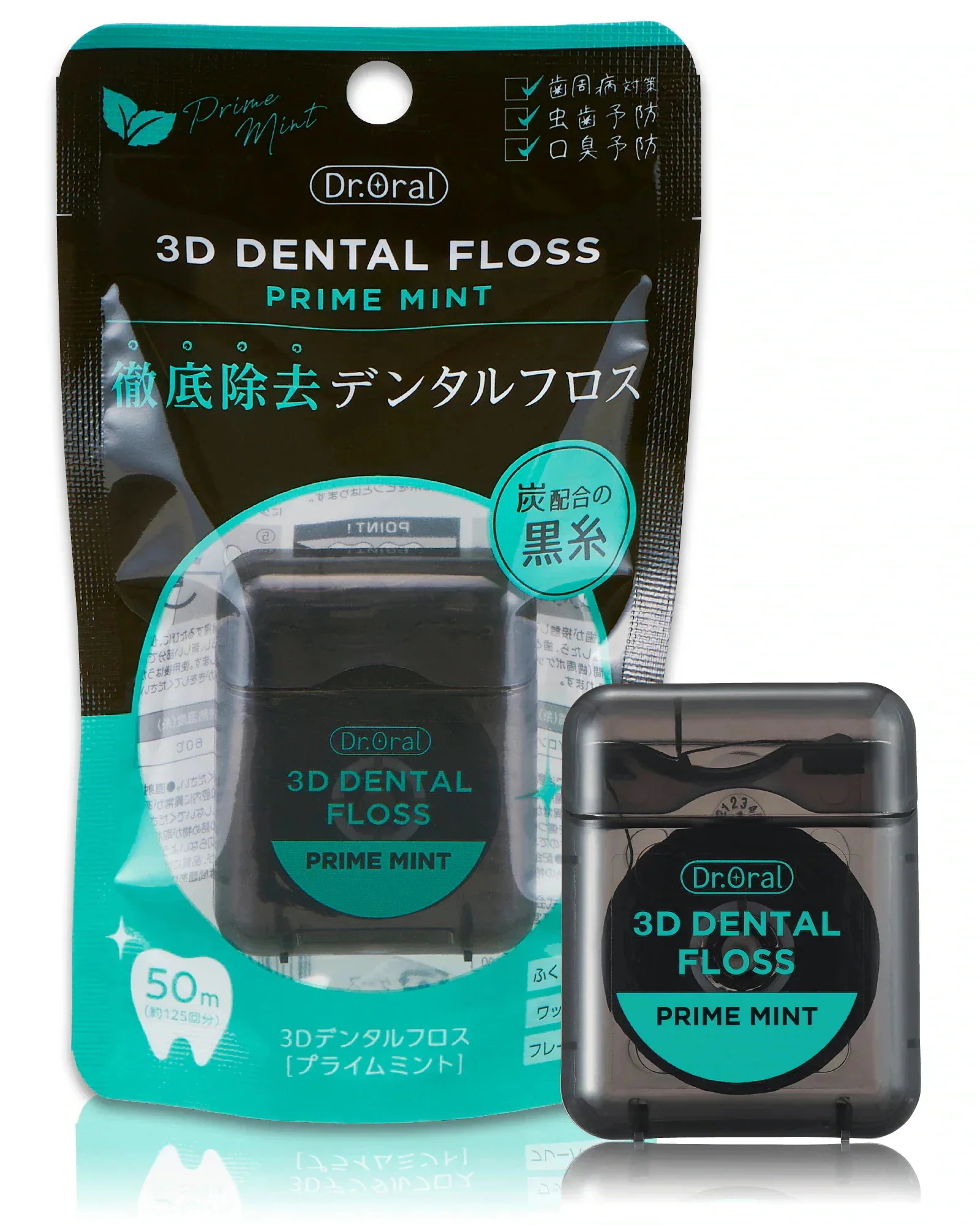 炭配合の黒いデンタルフロスで、歯間の汚れが目視出来て良い商品だと感じました。