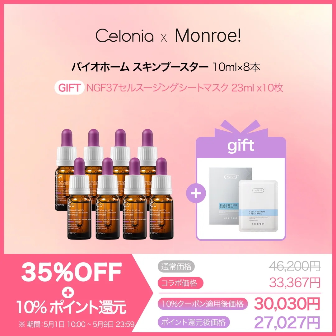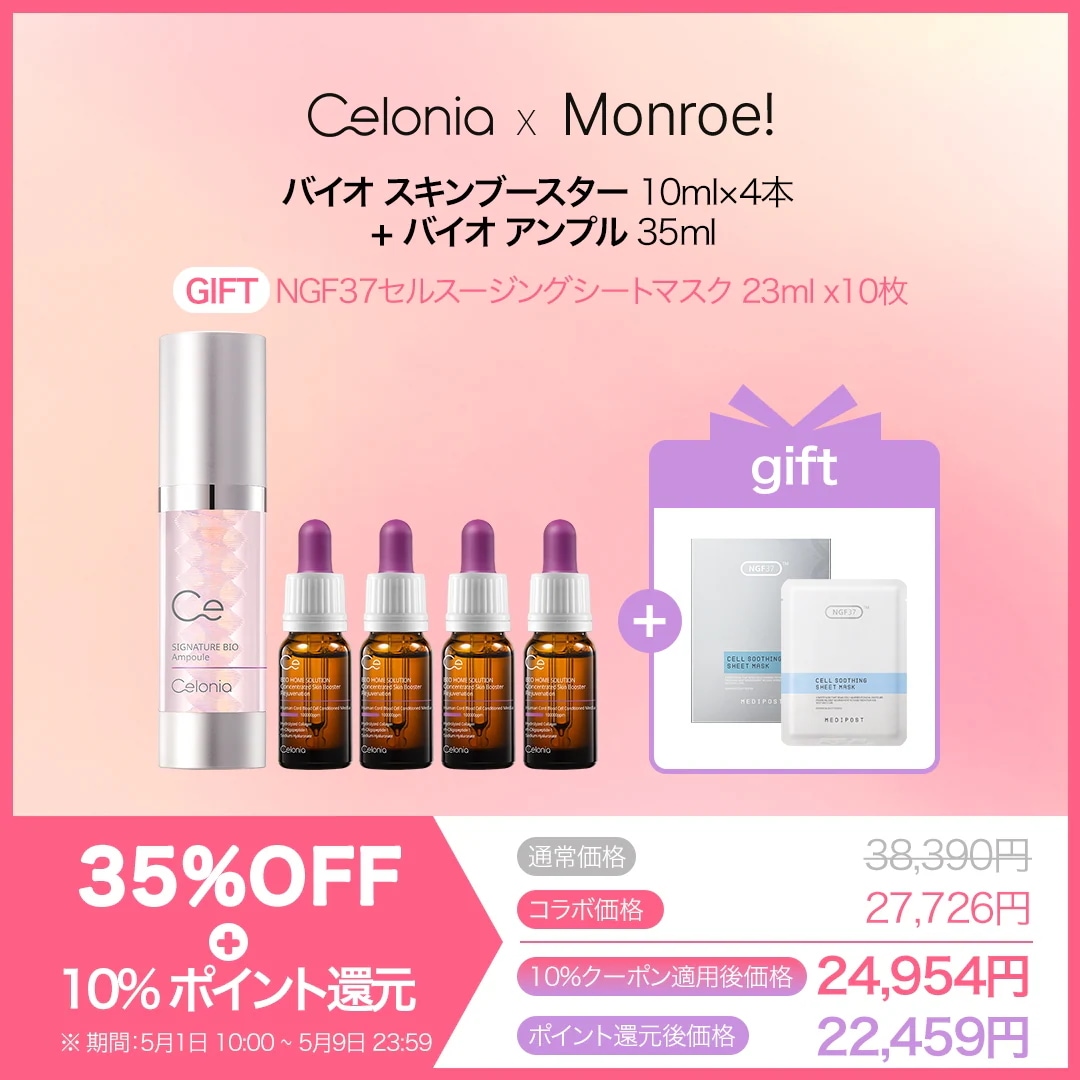 モン様コラボのcelonia!初めてのブランドさんで値段はお高めですが、なんせ成分が凄くて期待しかなかったです(詳しくはわかりませんが、ヒト臍帯血幹細胞培養液いっぱい…効きそう)。ブースター&アンプル使ってみました!ブースターは何かすいすい肌に入り込みます。すこい良い肌感です。もう1セット購入しても良かったかも…。モン様&celonia様、また次回のコラボ楽しみにしております。