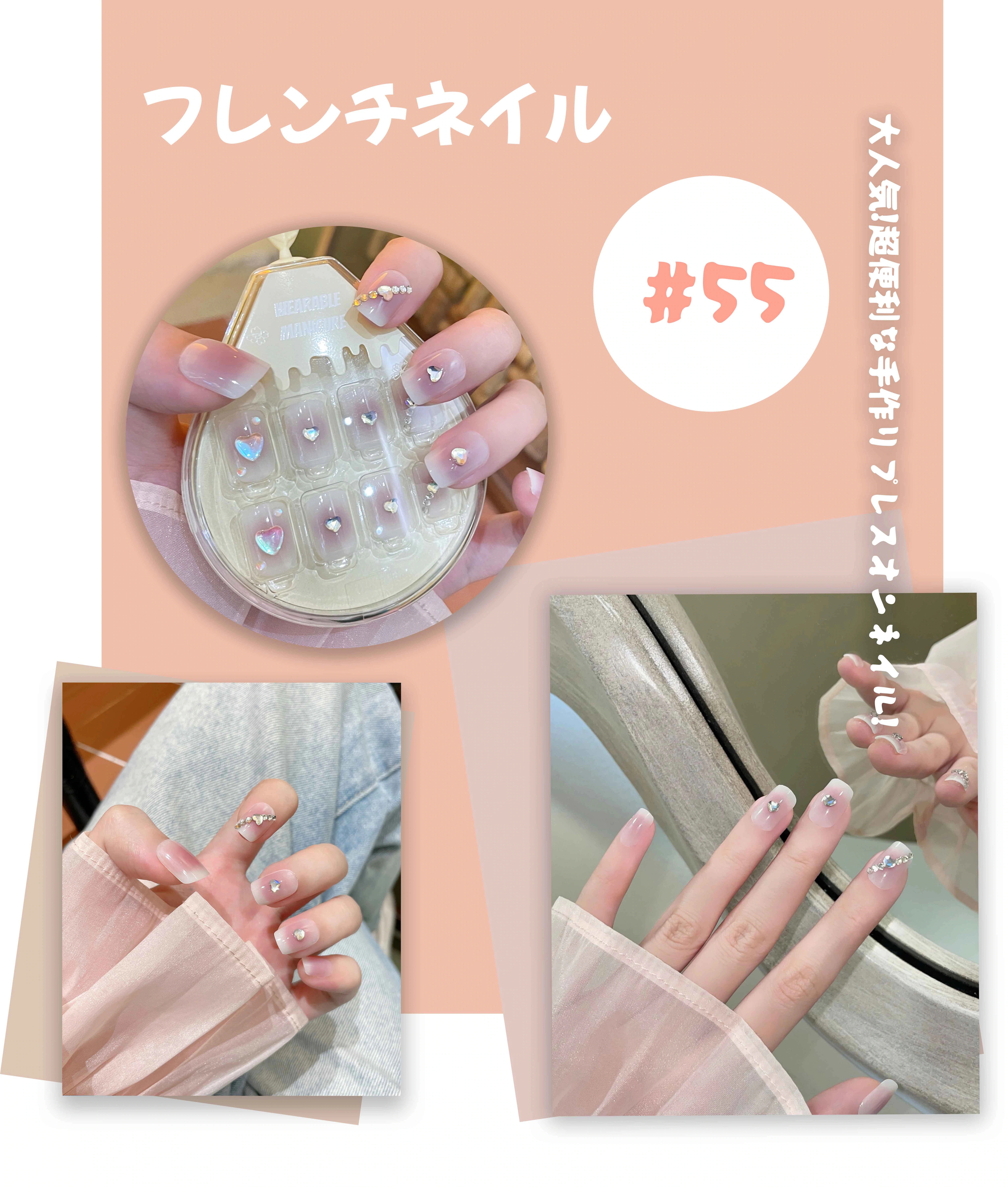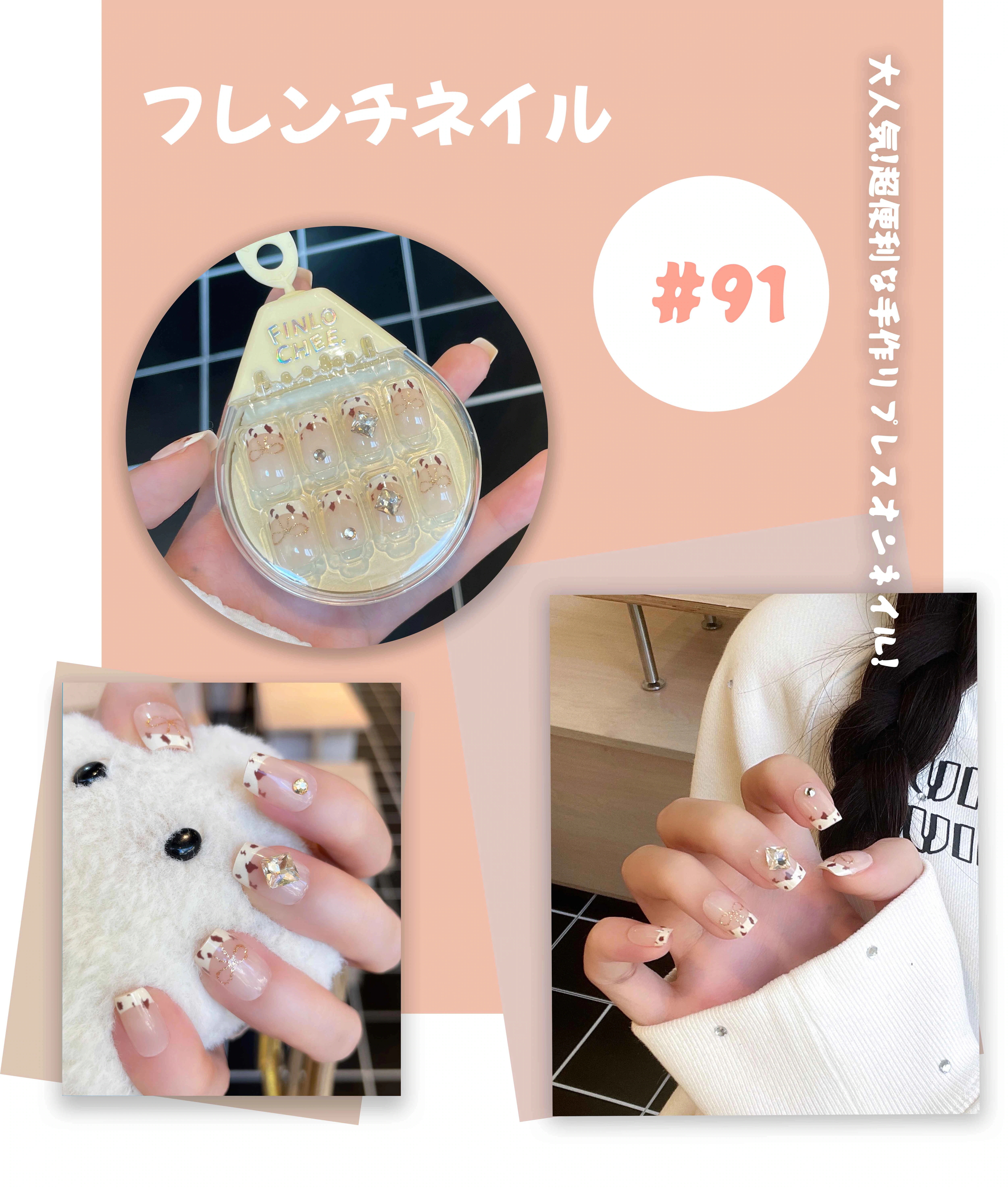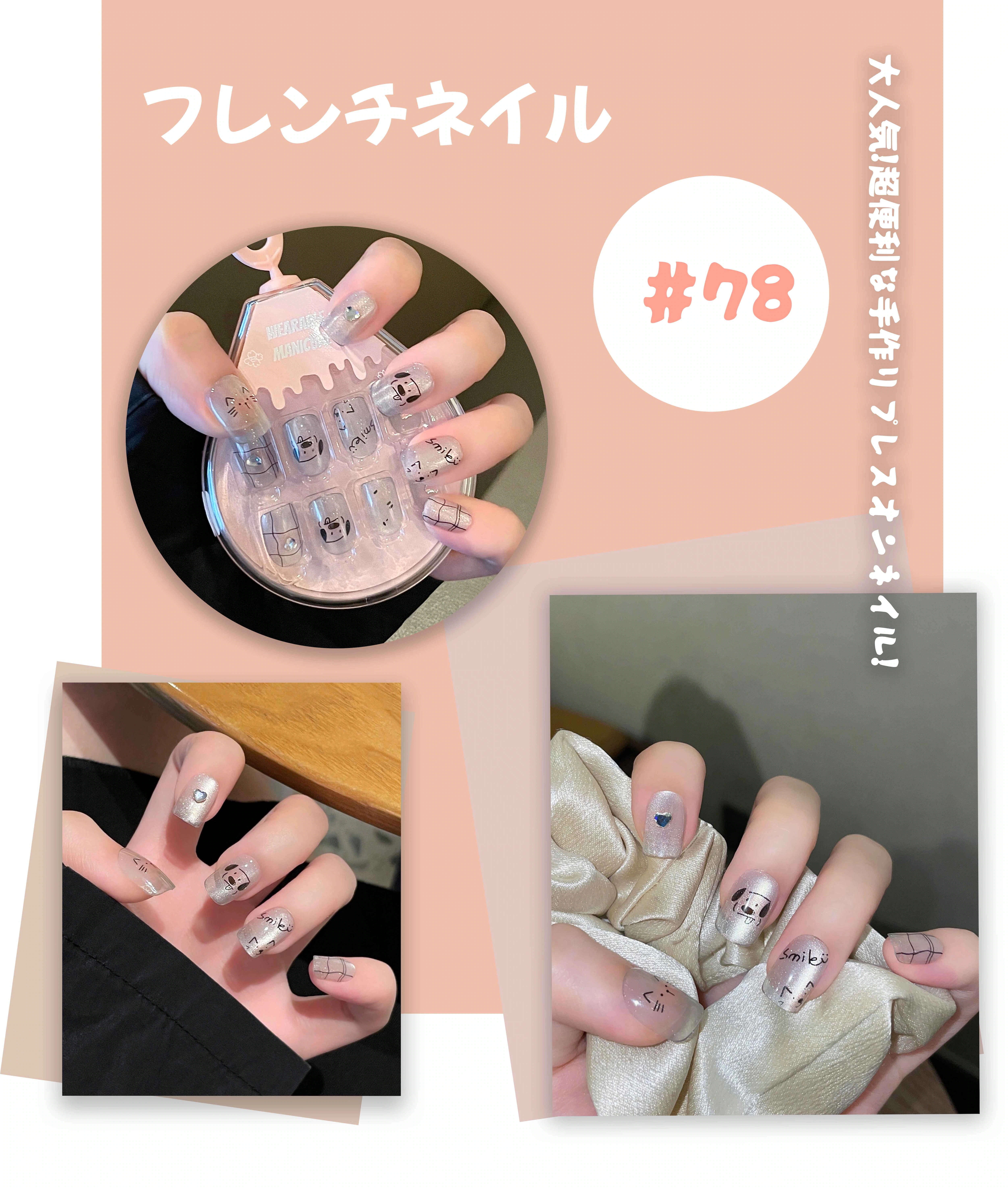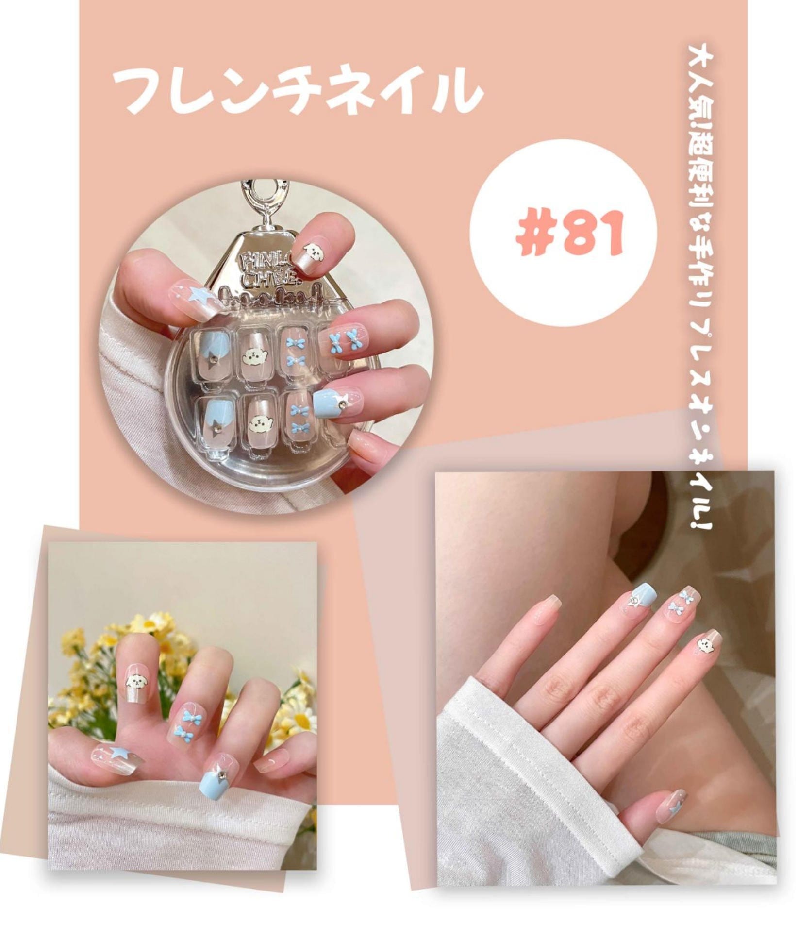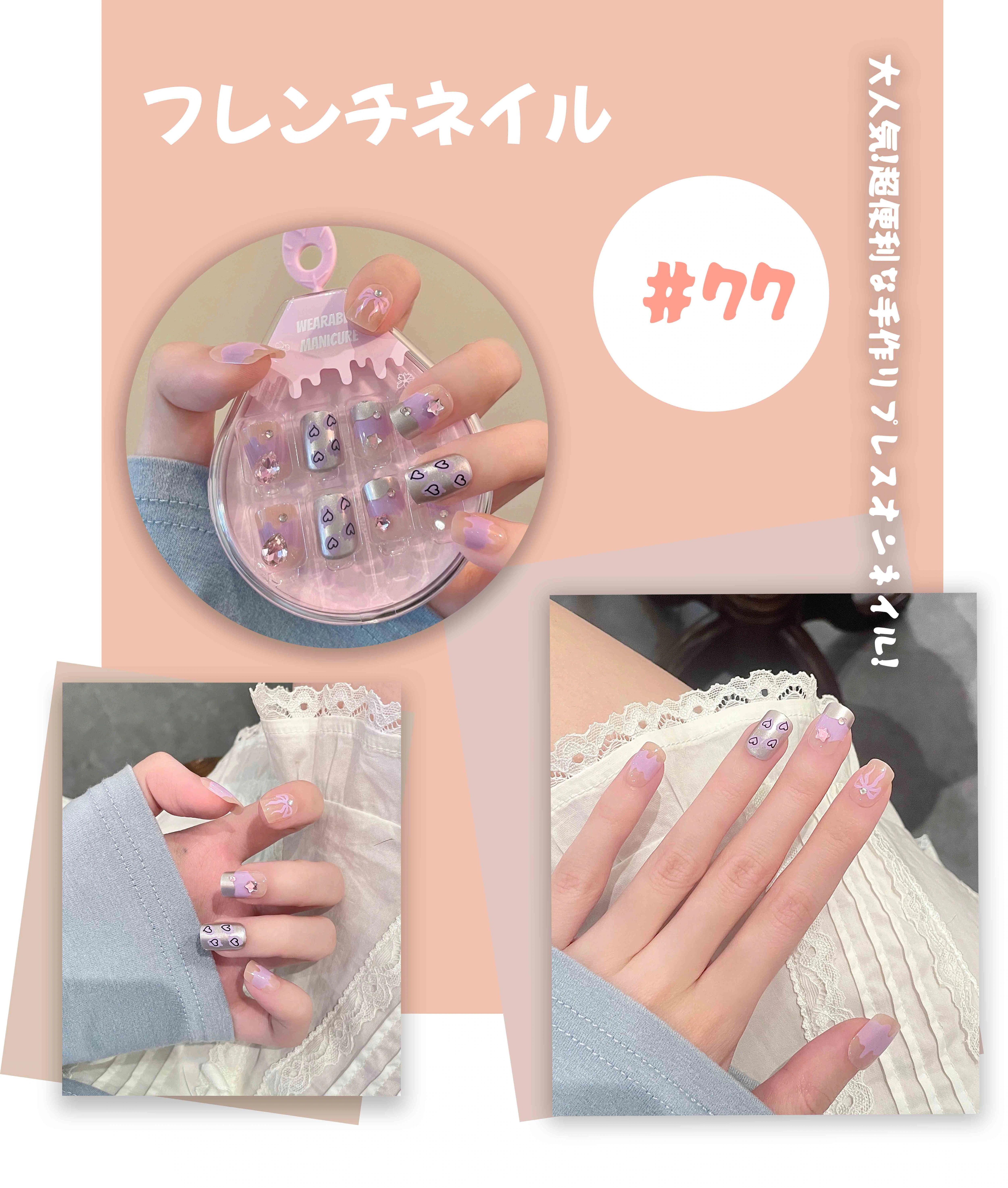 貼るだけで本当に簡単でした。デザインも写真通りで可愛いです。サイズも意外と合いやすく、付属の粘着グミでしっかり密着しました。遠目だとサロンネイルみたいで満足。耐久性も問題なくて、この値段なら十分過ぎる満足感です。