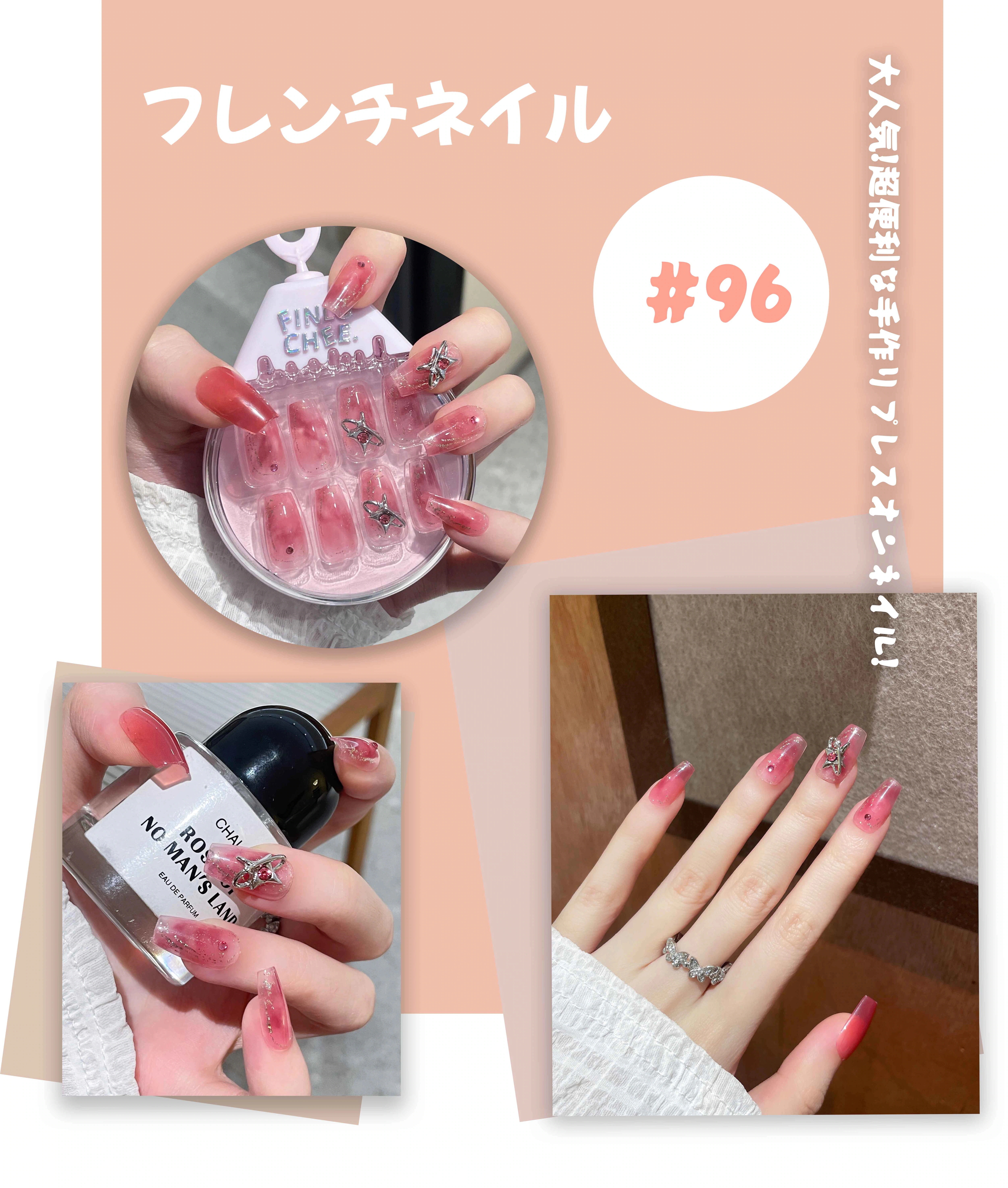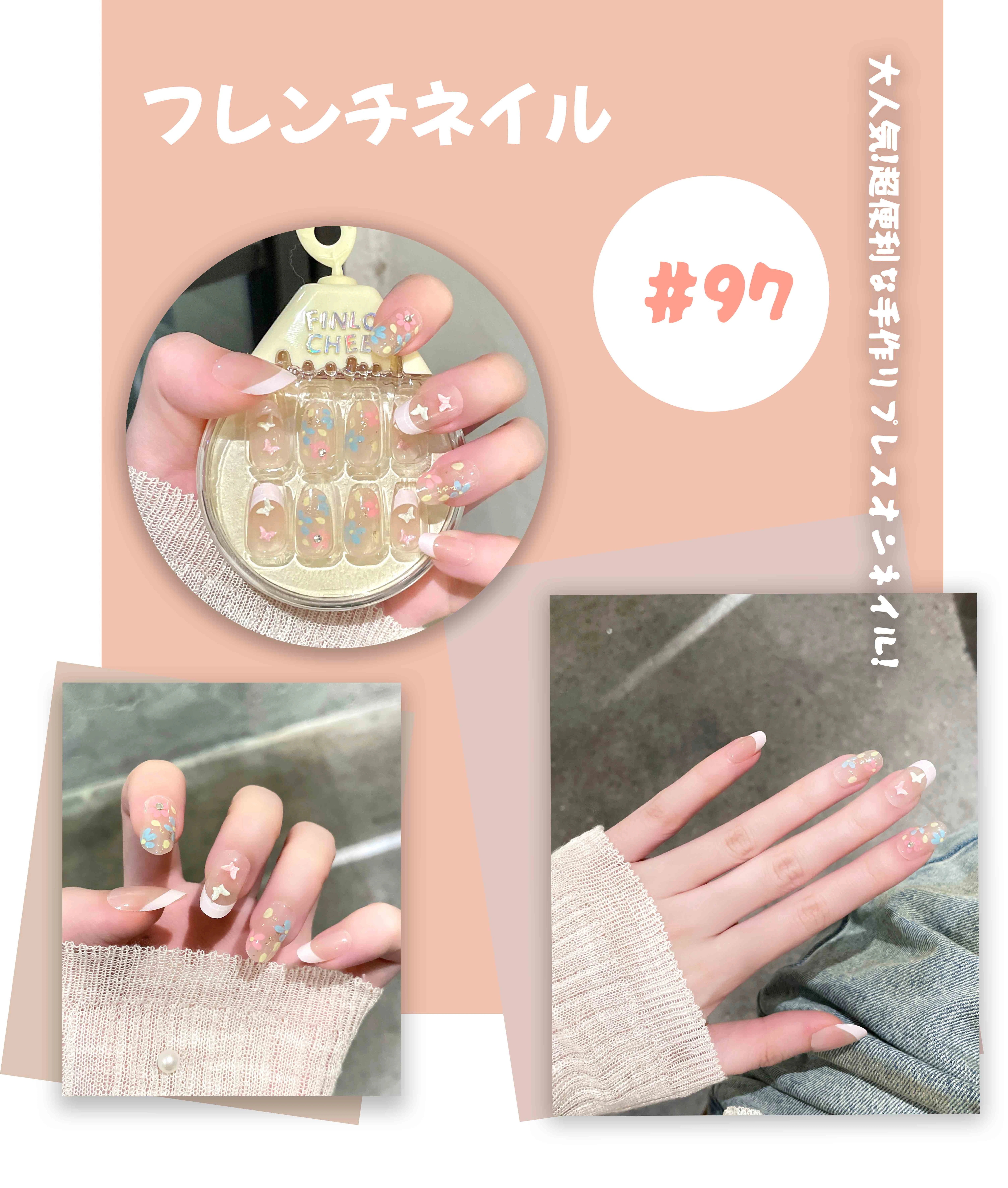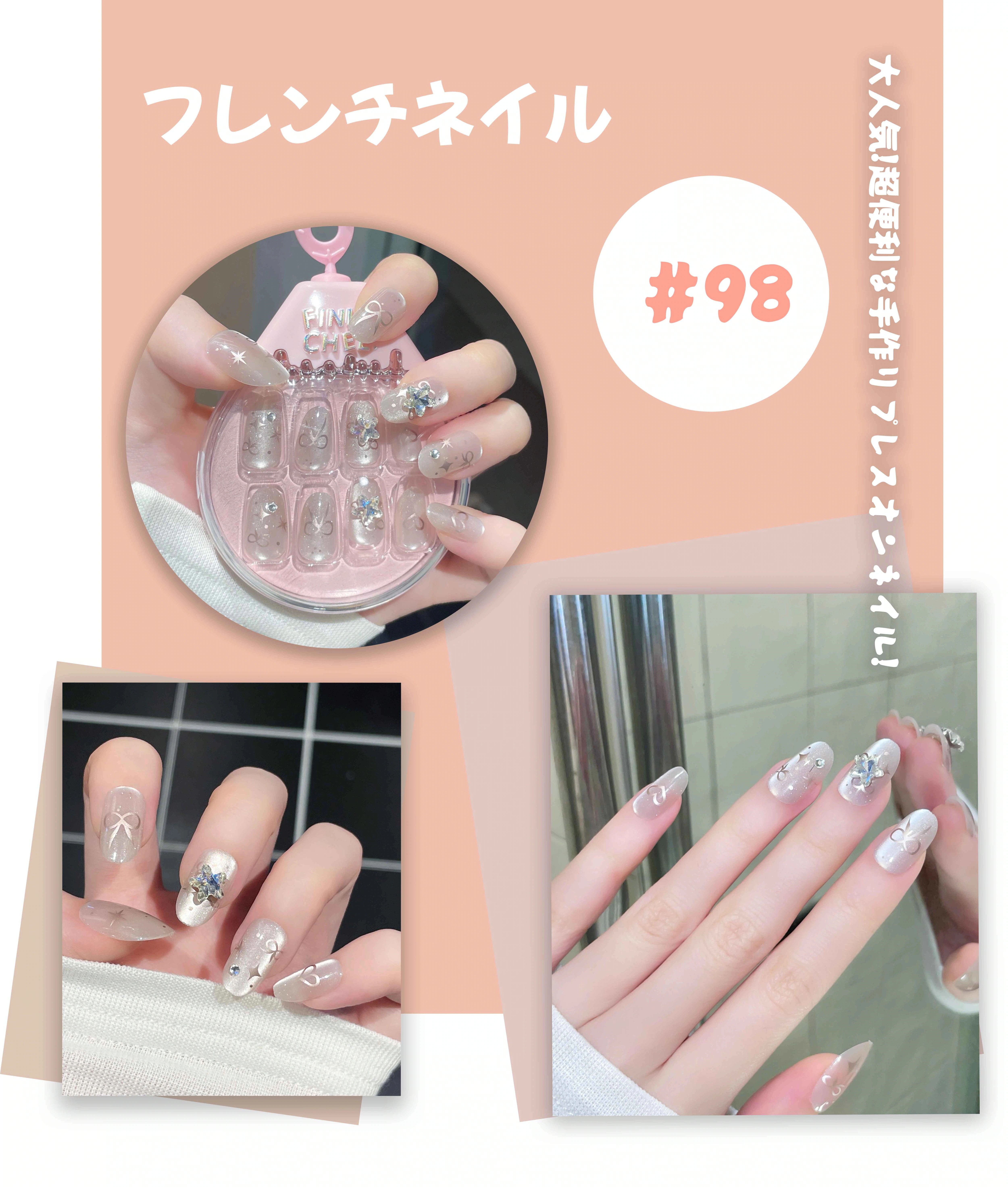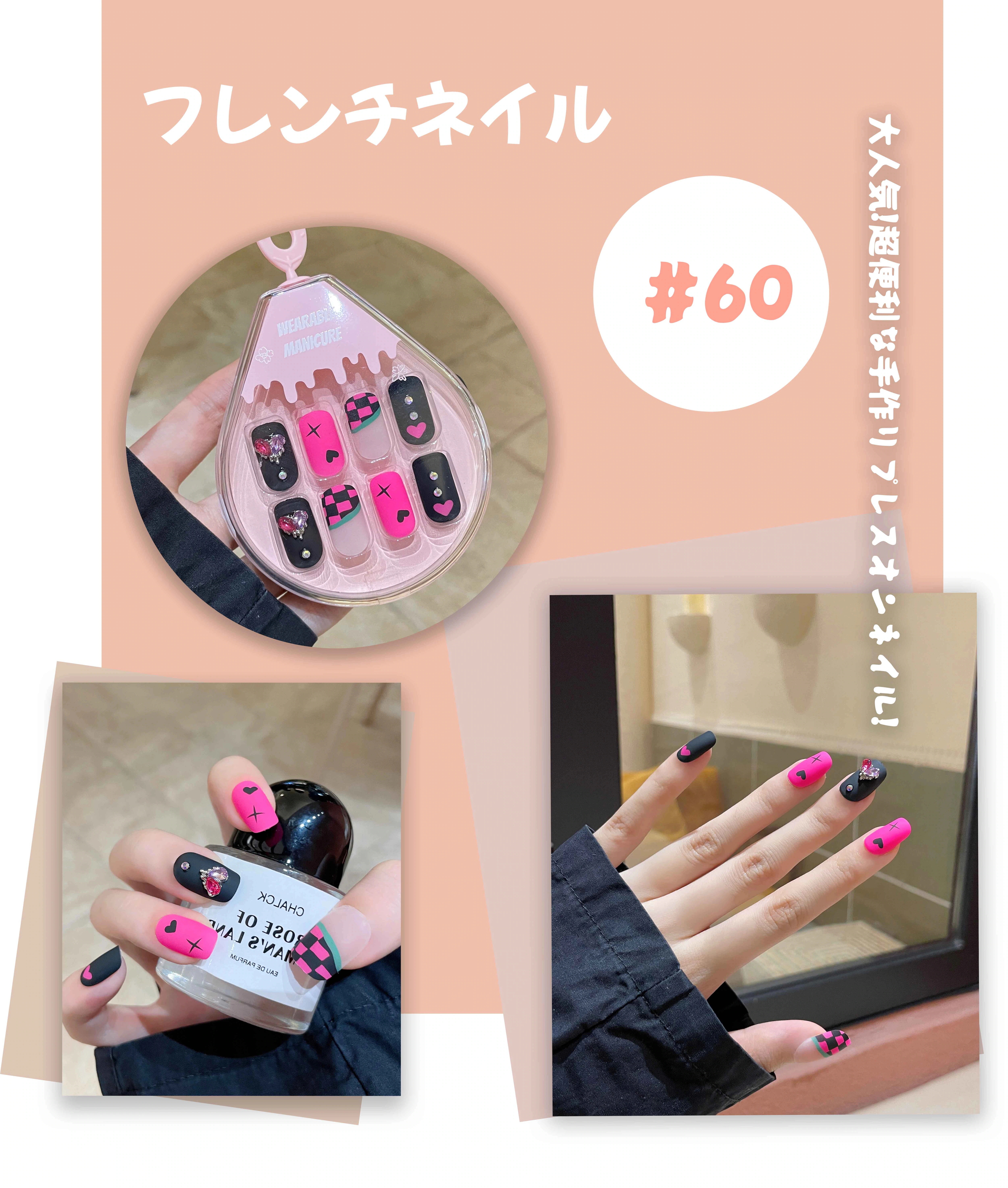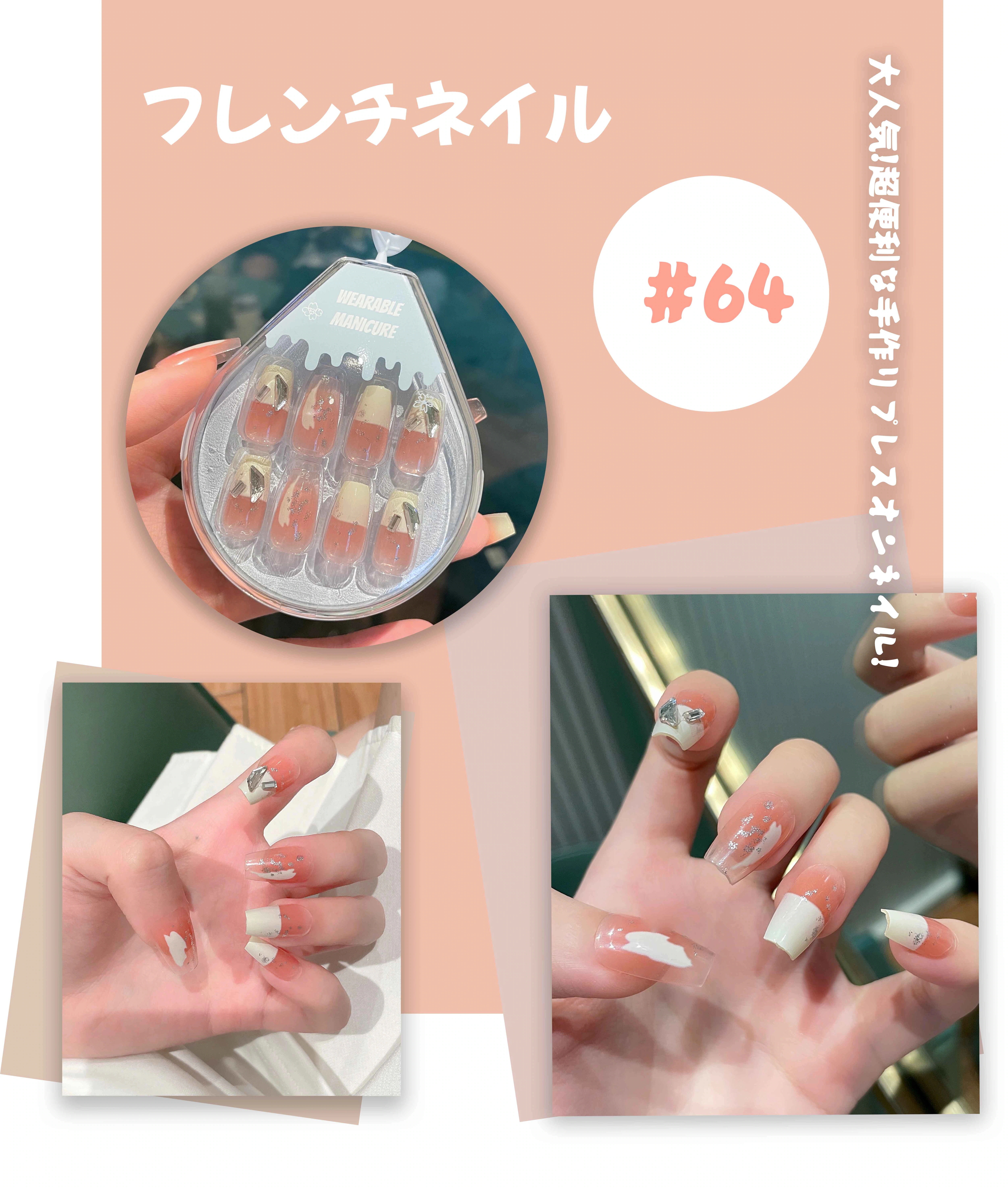 貼るだけで本当に簡単でした。デザインも写真通りで可愛いです。サイズも意外と合いやすく、付属の粘着グミでしっかり密着しました。遠目だとサロンネイルみたいで満足。耐久性も問題なくて、この値段なら十分過ぎる満足感です。