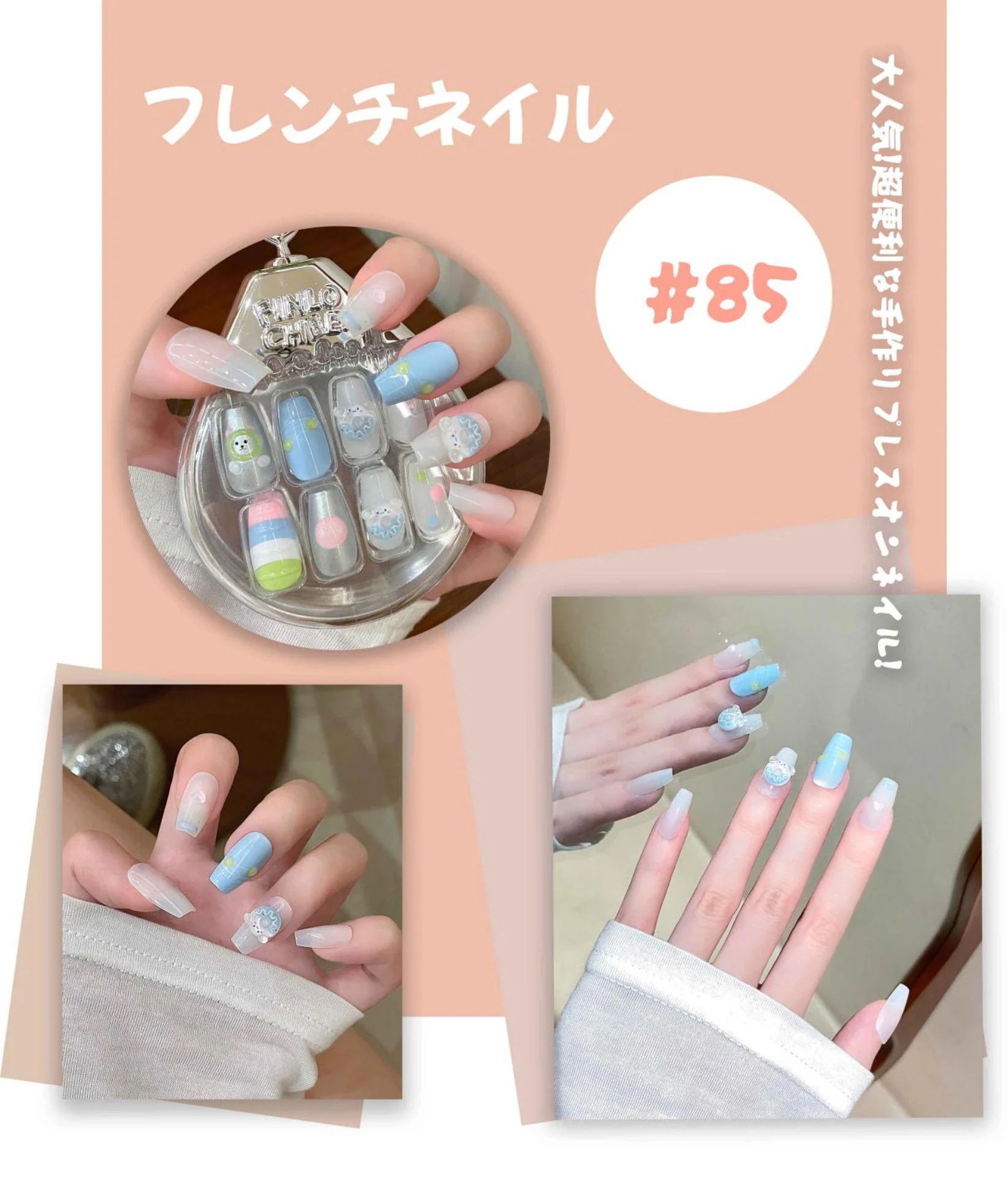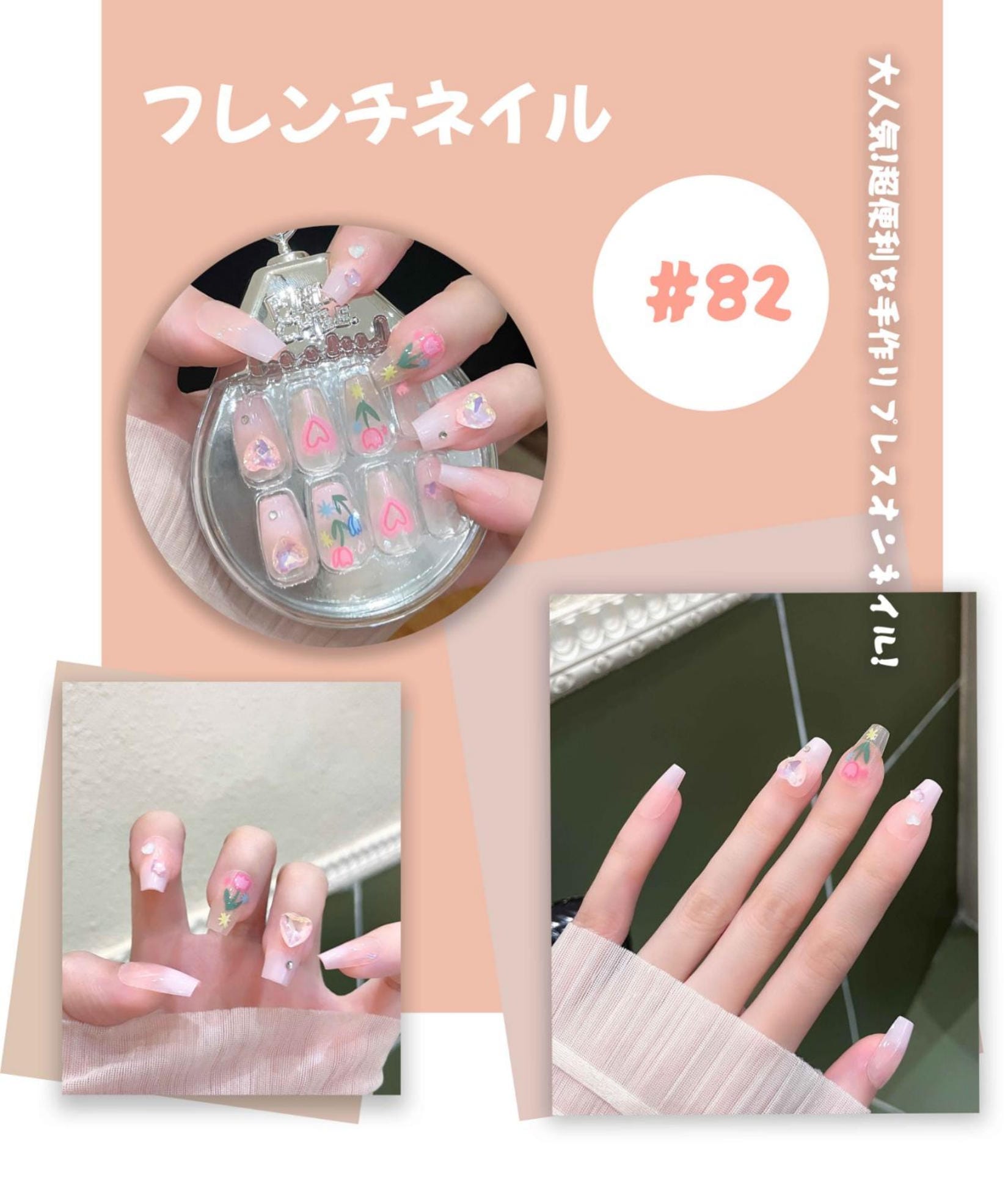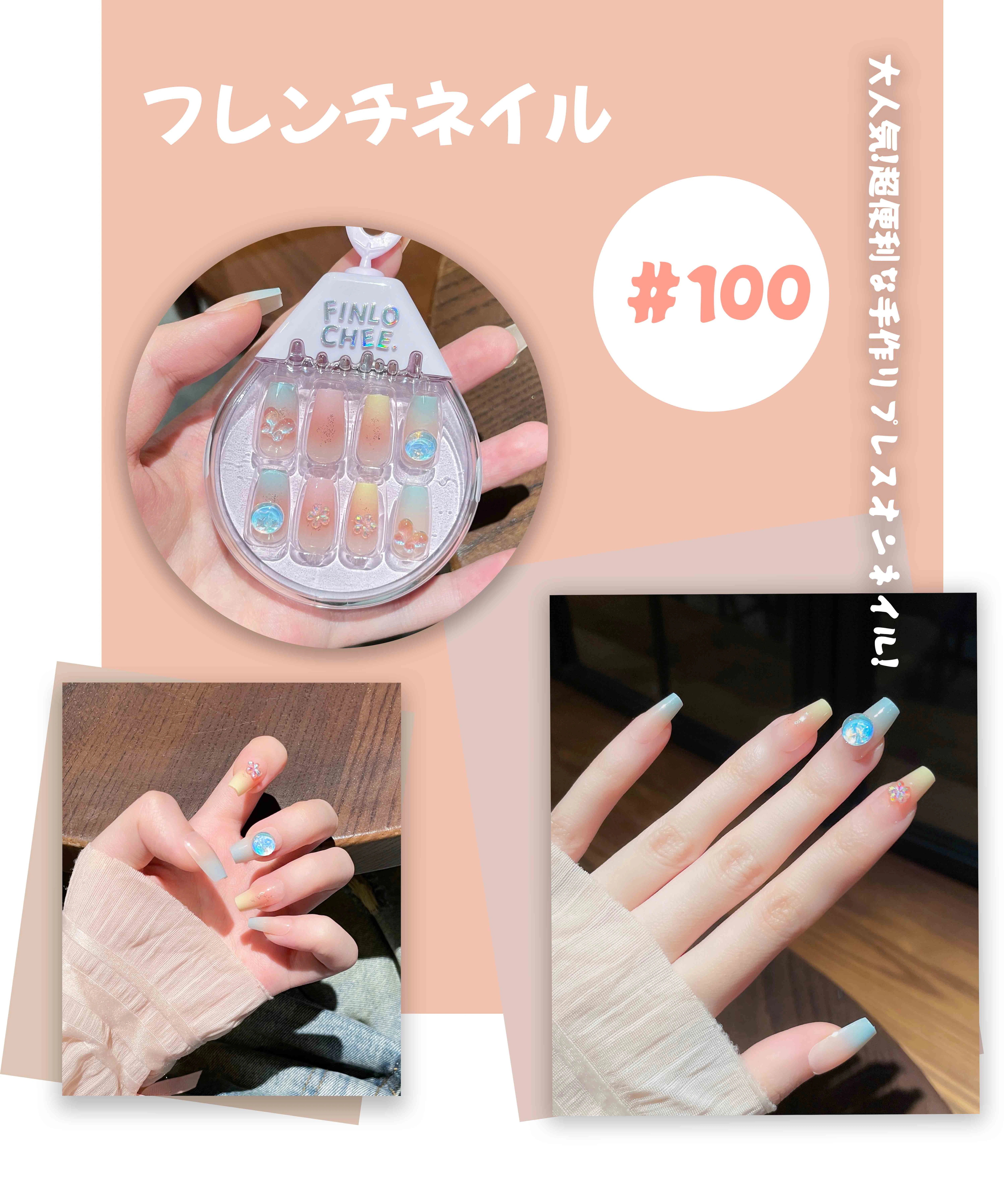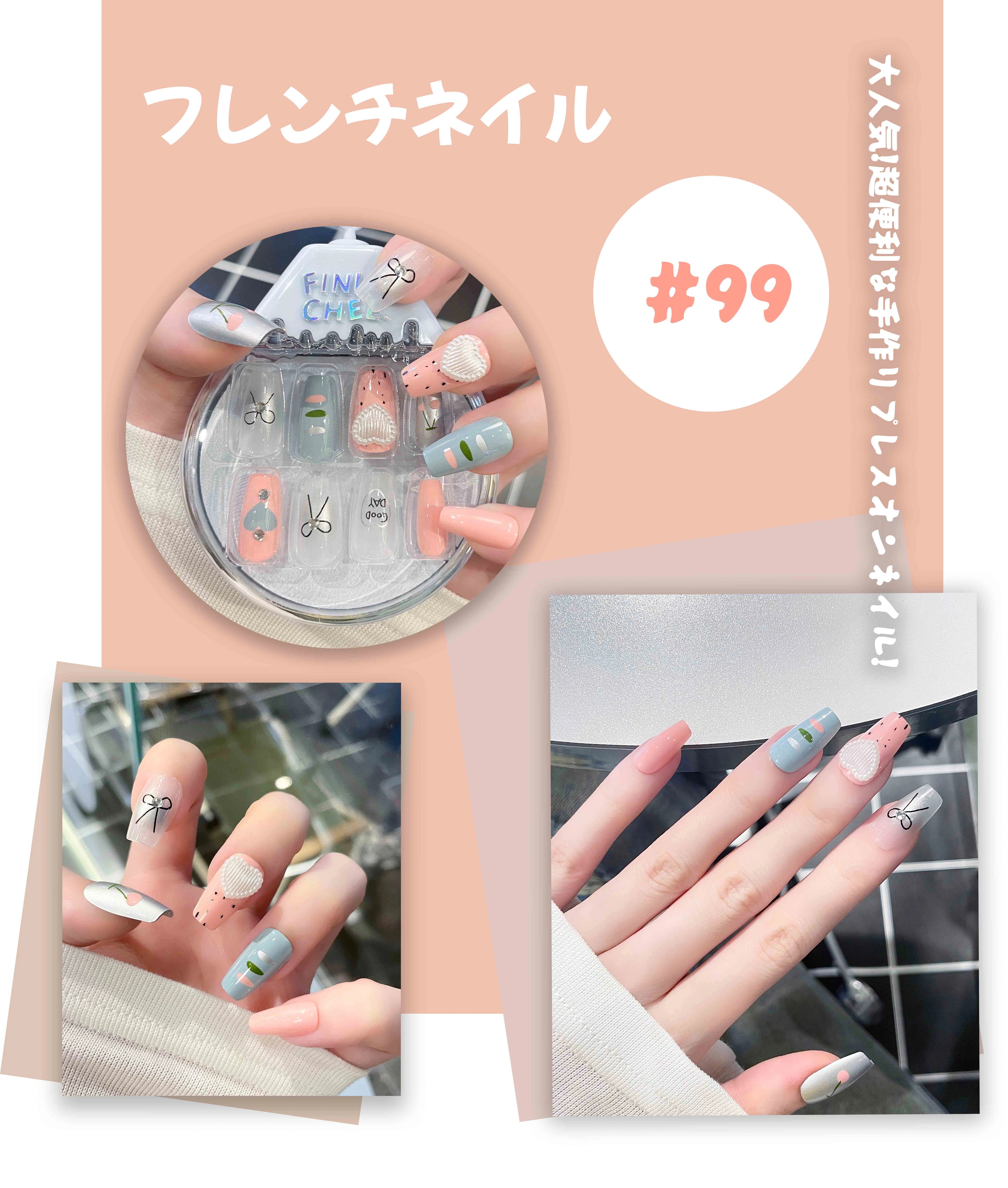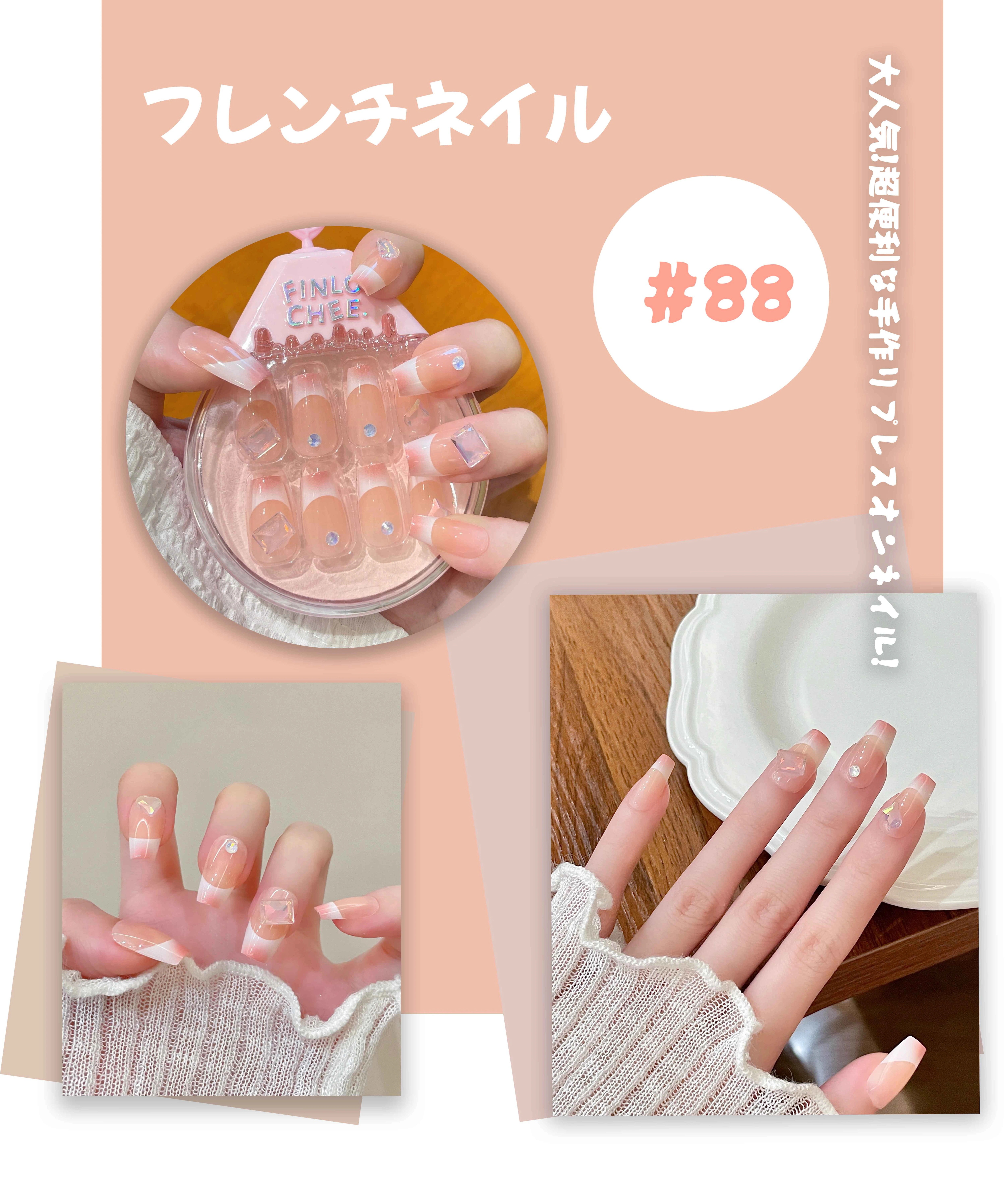 スクエア型のチップで色味も可愛いです。届いた時8本しかない!?とびっくりしましたが(購入するとき画像の中の本数をきちんと見ていなかった・・)中に他のサイズもきちんと入っていました。甘皮処理の棒、ケア用の濡れコットン、爪やすり、粘着シールが付属されておりネイル初心者ですが使いやすかったし、とりあえず一通りの付属が付いていてこの価格なので満足です。他のデザインも購入しようかと思っています。