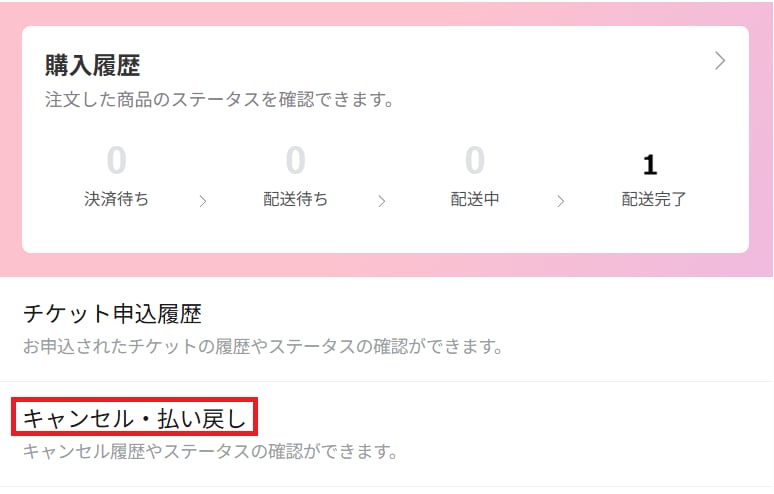 ①ログイン後、 MY の「キャンセル・払い戻し」を選択
