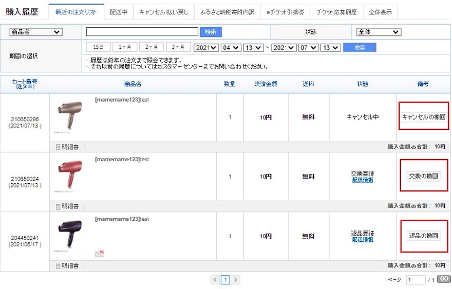 返品/交換/キャンセル要請を撤回/取消したいです。