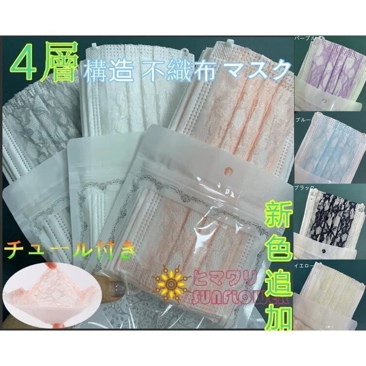 レースマスク50枚 不織布マスク 4層構造 メッシュマスク大人 使い捨てマスク チュール付き 花粉症対策 お花見
