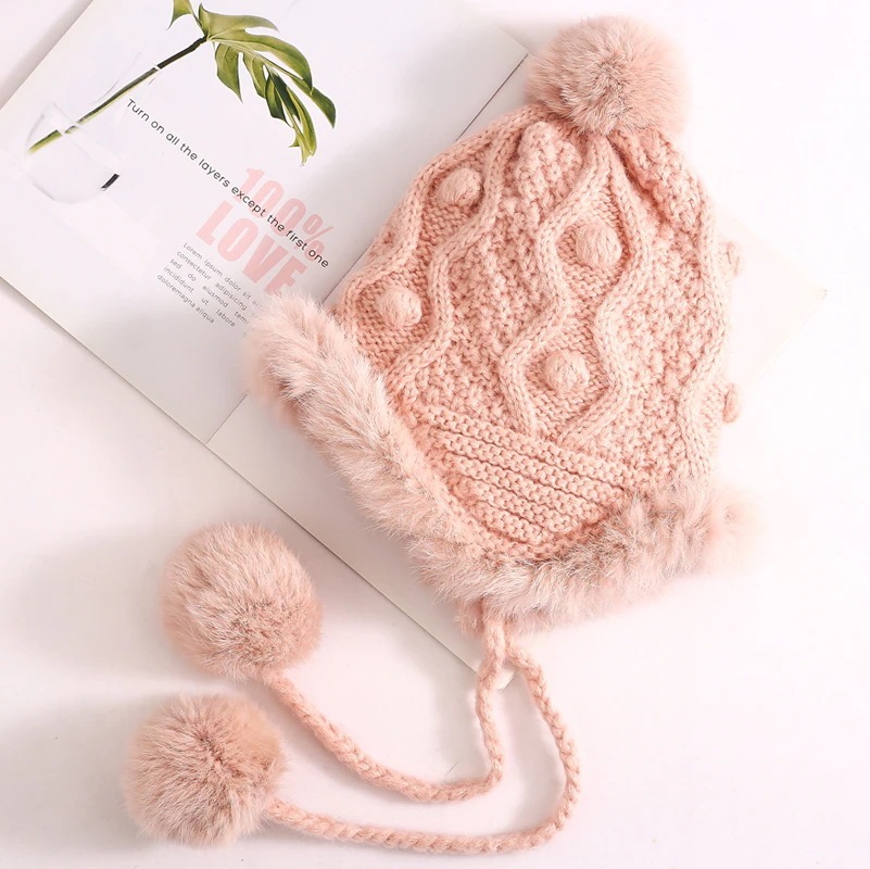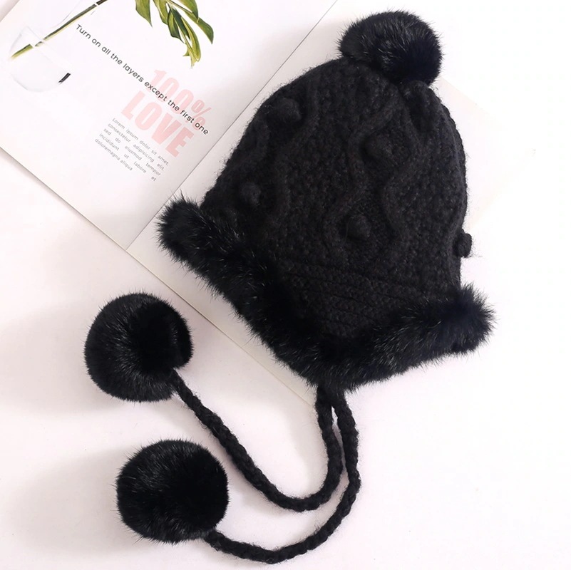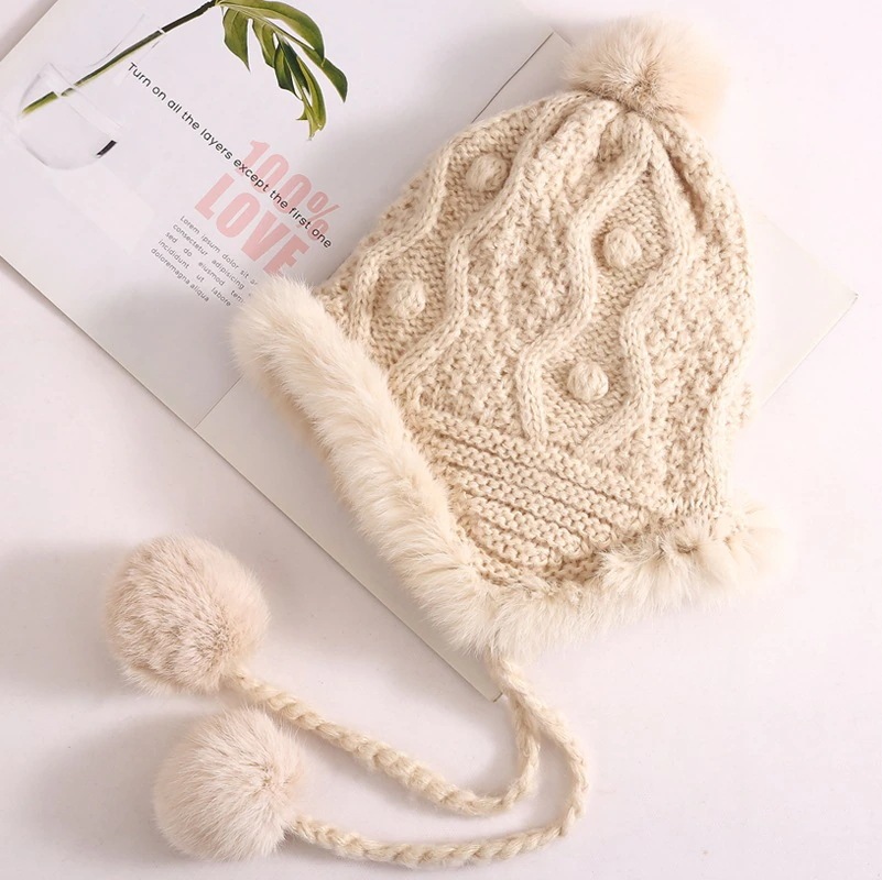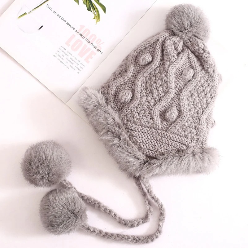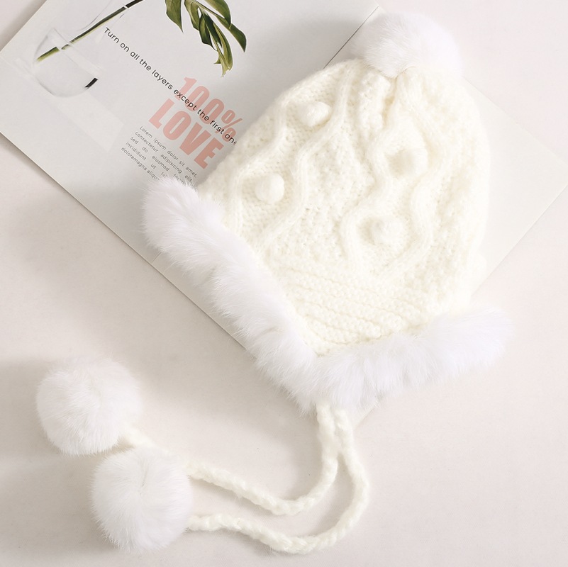 白いウサギの毛皮の冬の雪のウールの帽子の女性のかわいい毛皮のボールの耳の保護毛皮のレイ風水帽子暖かい帽子のぬいぐるみ