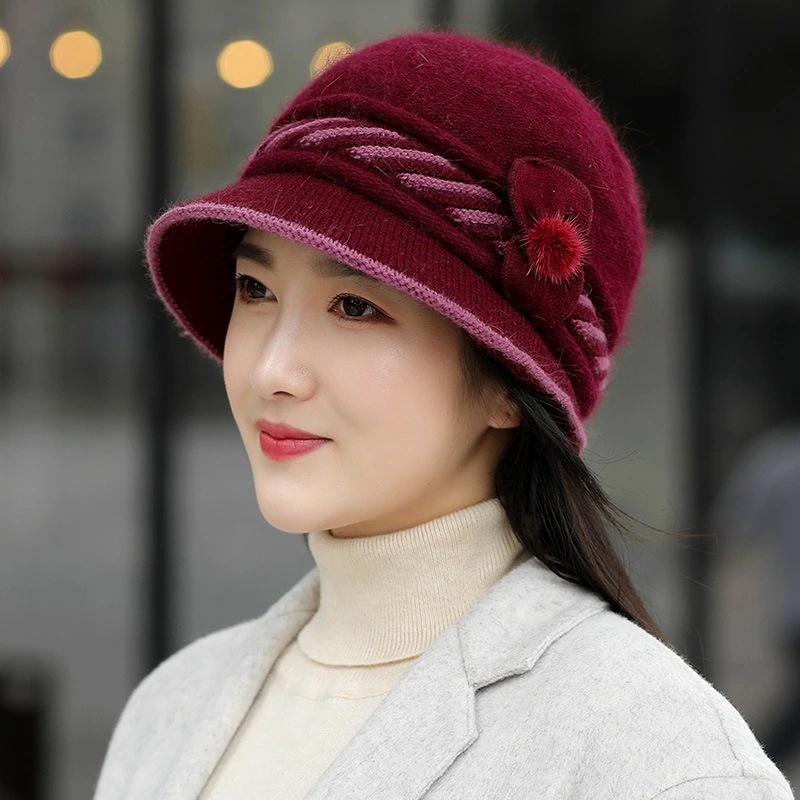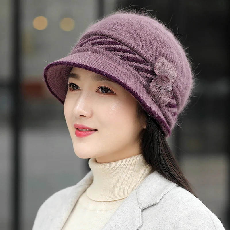 帽子 レディース 秋冬 韓国語バージョン ファッション ウサギの毛の帽子 中高年 ニット ウール キャップ ひさし キャップ 暖かい耳保護キャップ