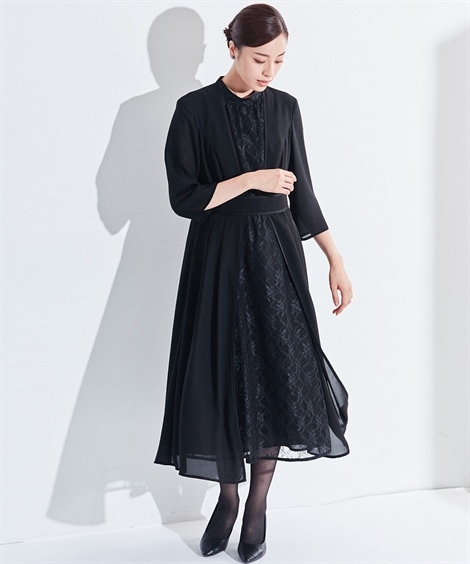 | 材料/素材 | 品質=[表地]ポリエステル100%(織物) [別布]ポリエステル100%(編物)[裏地]有(身頃部)後スナップ付ファスナー開・ウエスト後ゴム入※レース柄が多少異なる場合があります。生地の厚み:普通伸縮性:なし透け感:やや有りシルエット:普通光沢感:なし | ||