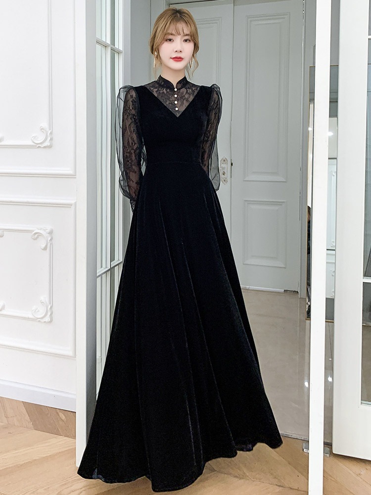 おしゃれロング ドレス パーティードレス 個性的 黒 袖あり 長袖 レース おしゃれ 結婚式 二次会 お呼ばれ フォーマル 演奏会 発表会 大人 かっこいい-771