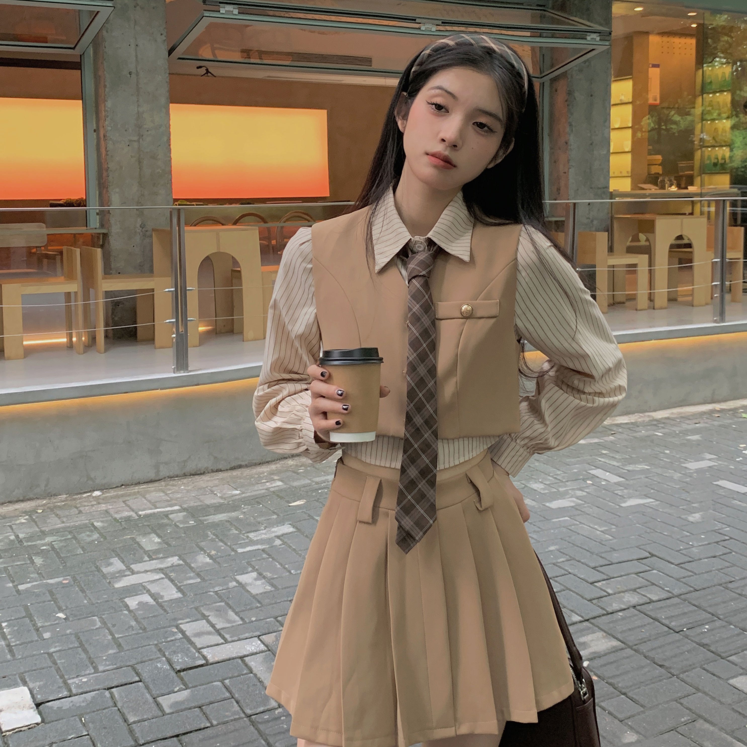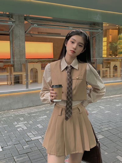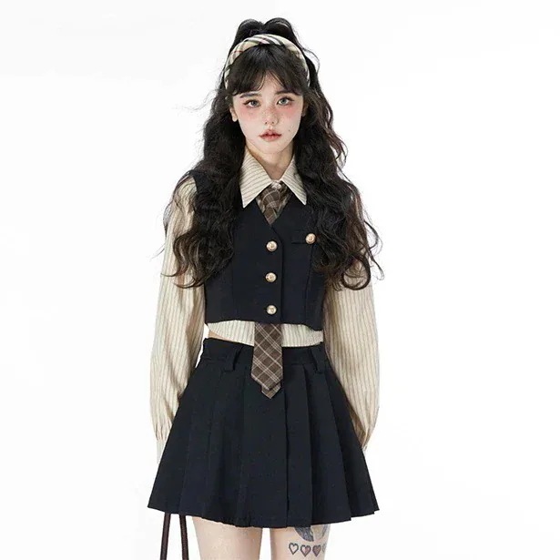 スーツセットアップスーツセットレトロなカレッジ風シャツ+ベスト+プリーツスカートのスリムショート丈4点セット
