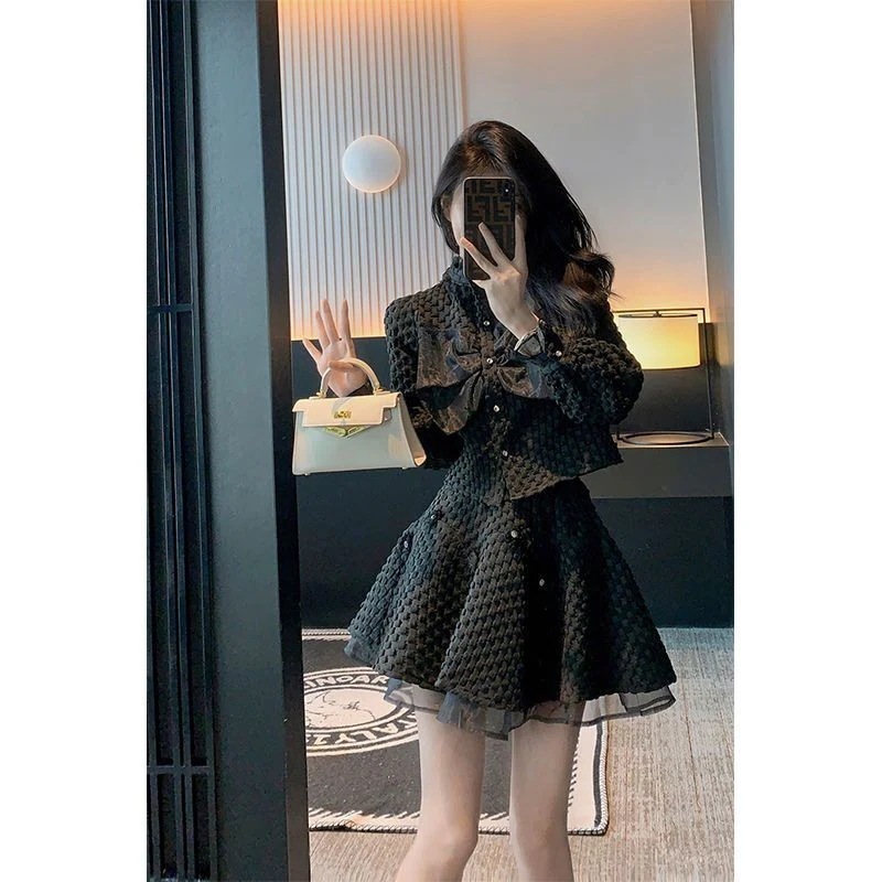 スーツセット 黒 スーツスカート春 新作 長袖コートポンポン半身スカート