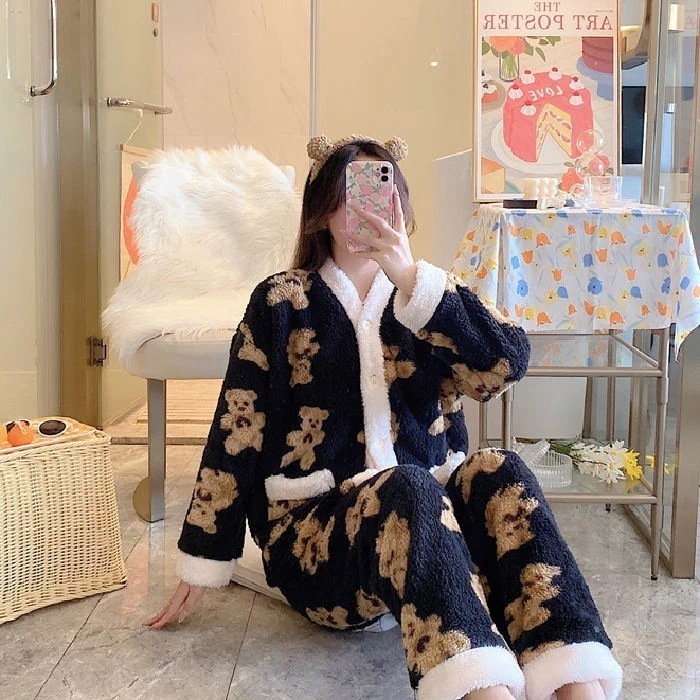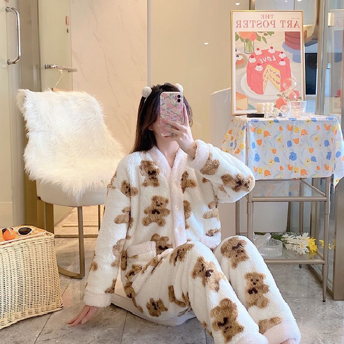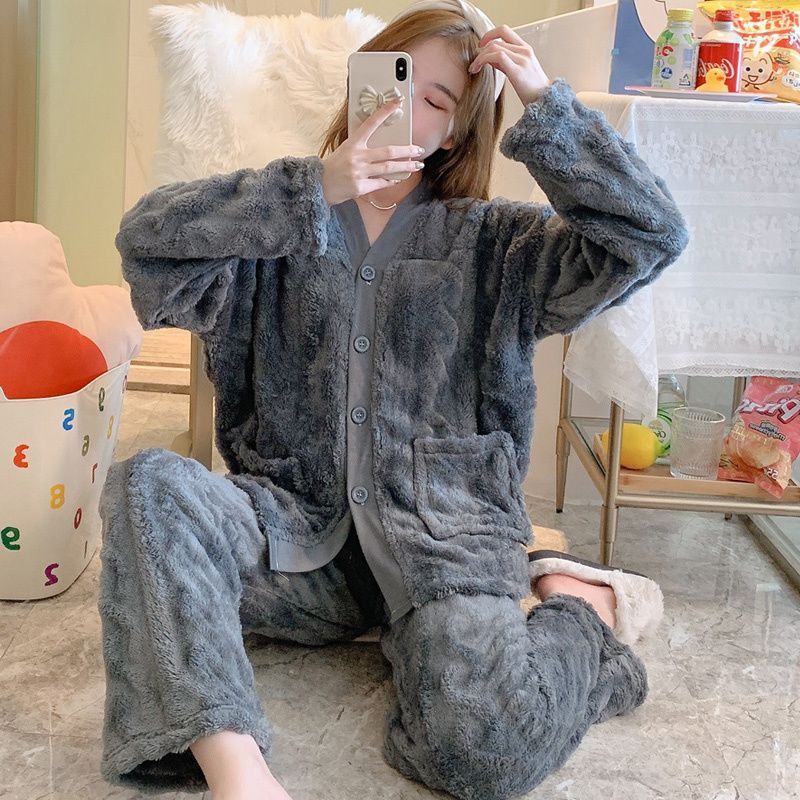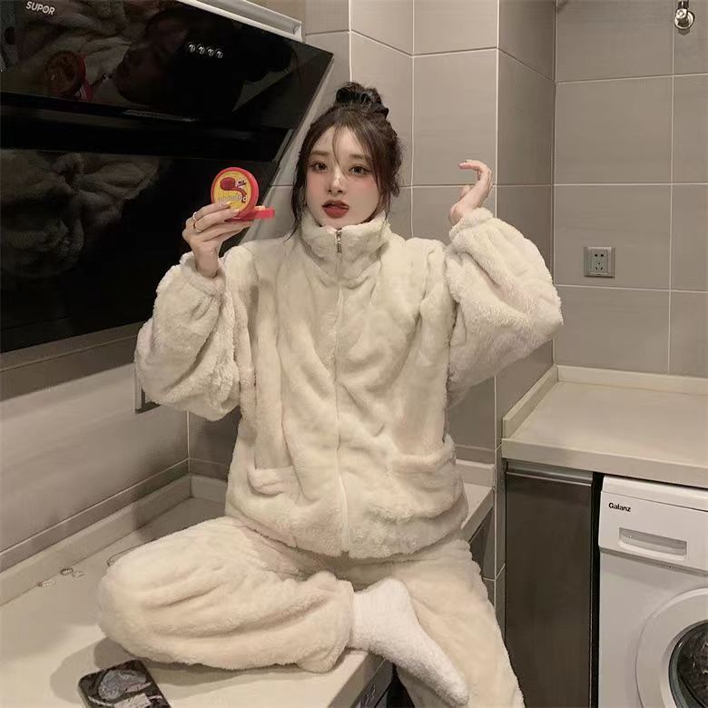 保温部屋着セットルームウェア厚手加絨パジャマ女珊瑚絨毯秋冬プリンセス風純色ジップフランネル