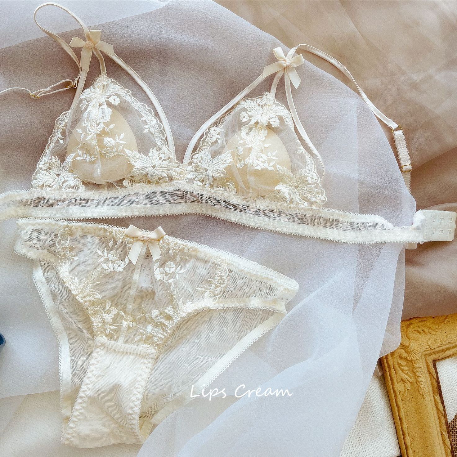 ナイトブラ可愛いセット下着 セクシーな薄手レース刺繍ブラ三角カップノンスチールリングバンプ透かし蝶結び下着セット