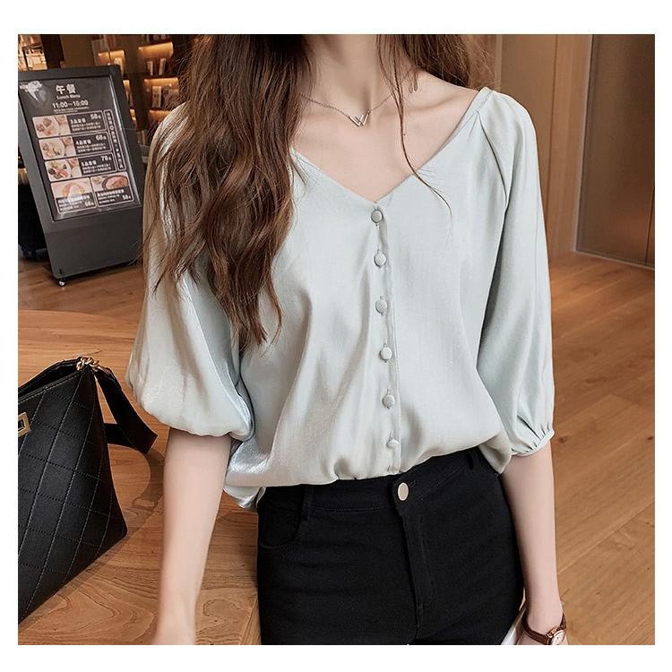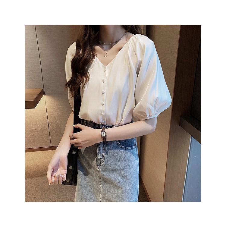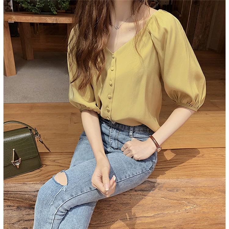 新作登場 シャツ ブラウス トップス シャツブラウス レディース 7分袖 無地 パフスリーブ フリル Vネック シフォン 袖デザイン 大きいサイズ ゆったり 優雅 30代 40代