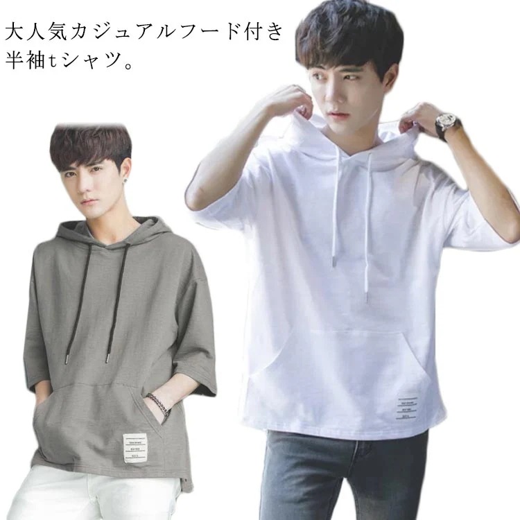 メンズ 夏服 半袖tシャツ フード付きtシャツ パーカー 大きいサイズ tシャツ フード付き パーカー 五分袖 シンプル 夏用 プルオーバー トップス 夏 大きサイズ 半袖パーカー