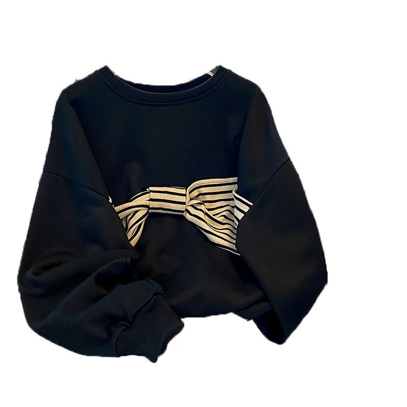 クルーネックトップス ボーダー柄蝶結び ベースボールジャージ ゆったり アウター お肌に優しい オリジナルデザイン