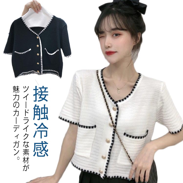 サマーツイードジャケット レディース 半袖 夏 ニット カーディガン サマーニット ツイードジャケット 薄手 接触冷感 涼しい ショート丈 Vネック トップス 羽織り オフィス カジュアル きれいめ