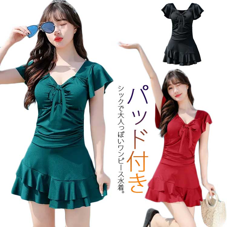水着 レディース ワンピース フリル リボン 体型カバー 水着ワンピース 水着 オトナ女子 Vネック オールインワン 無地 ウエスト お尻 太もも カバーアップ おしゃれ かわいい 大人 マ
