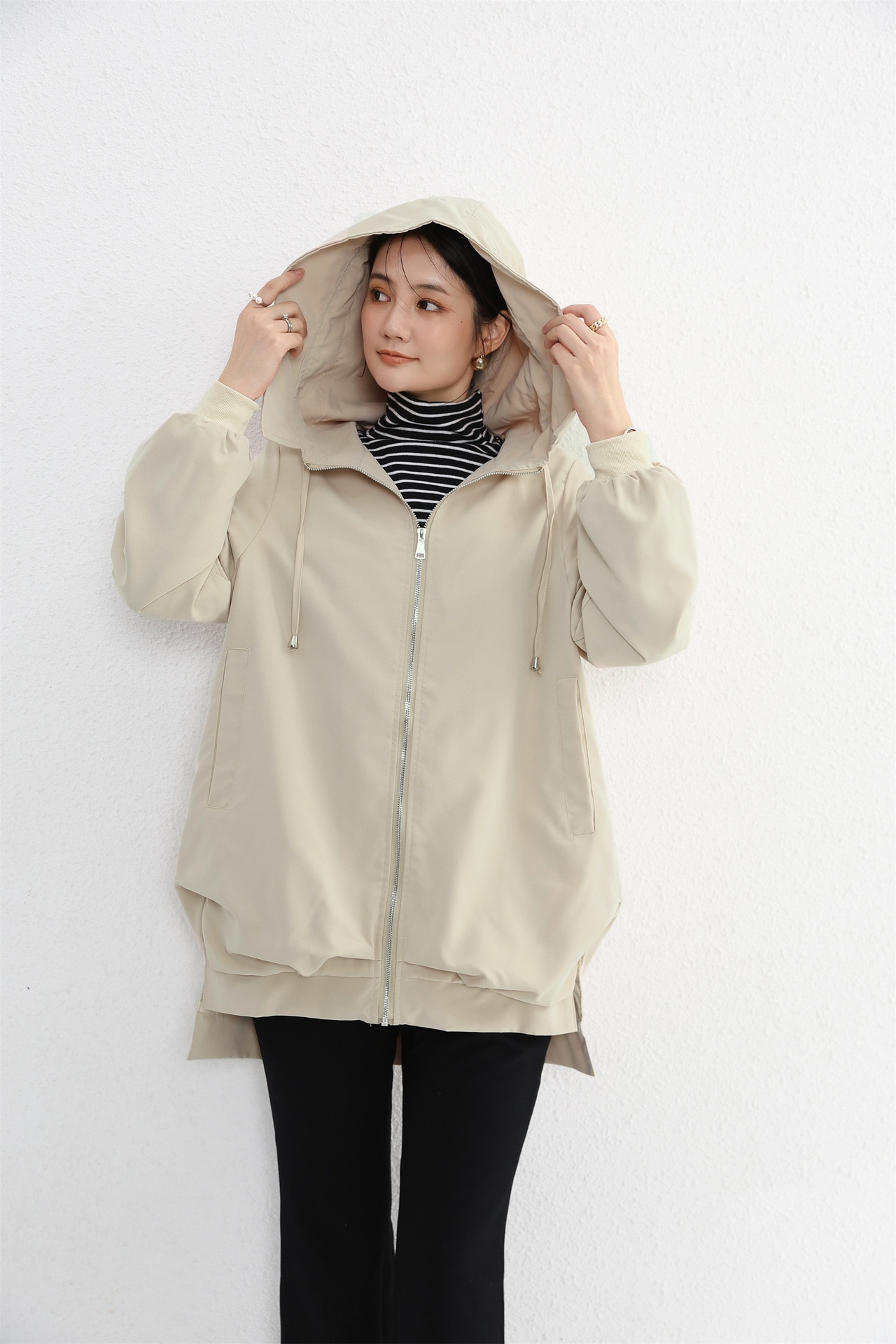 以前ベージュを購入。ヘビロテしていたのでへたったため、別色でリピです。生地が薄く、軽くなりましたね。ファスナーも持ち手が薄い。フードも小さくなった感じですが、以前のは風で脱げてしまっていたので、今回の方が良いです。ゆったり、気軽に羽織れるのが欲しい方にはオススメです。