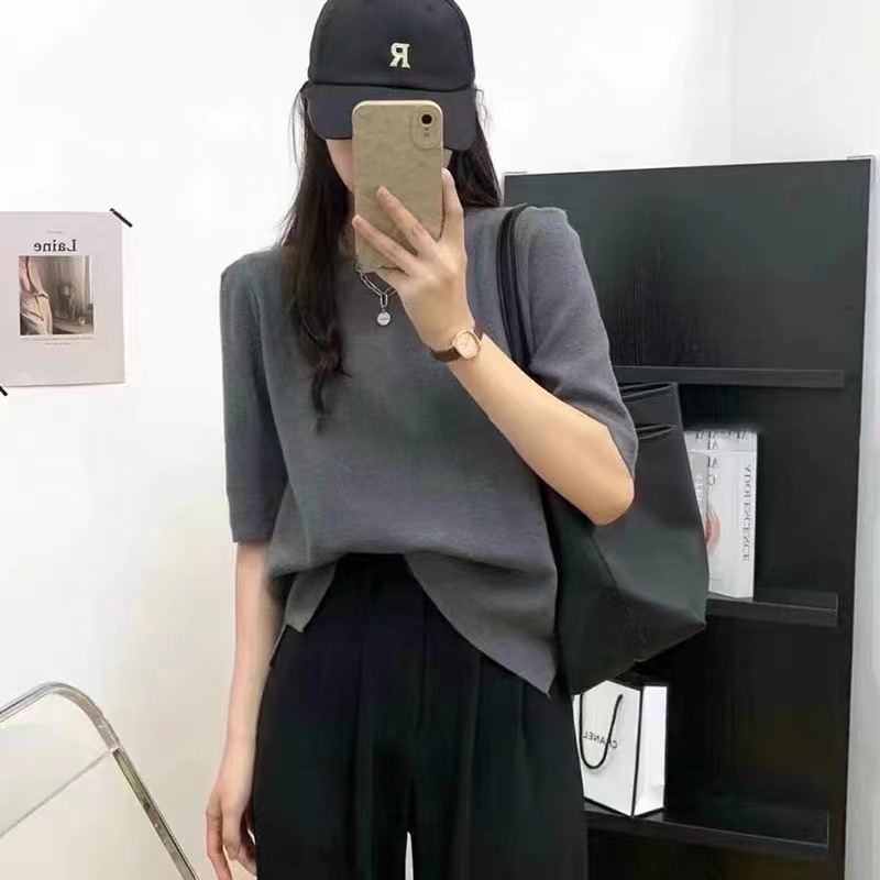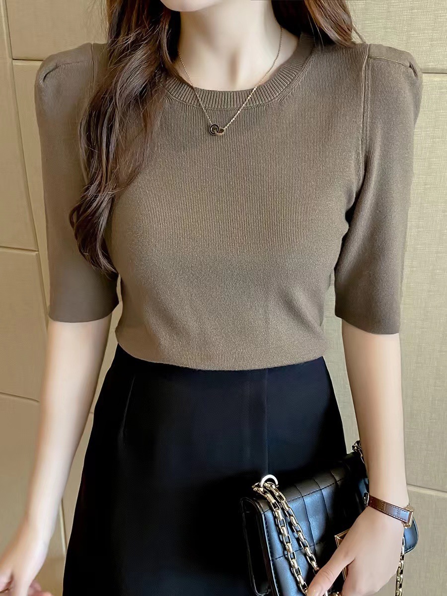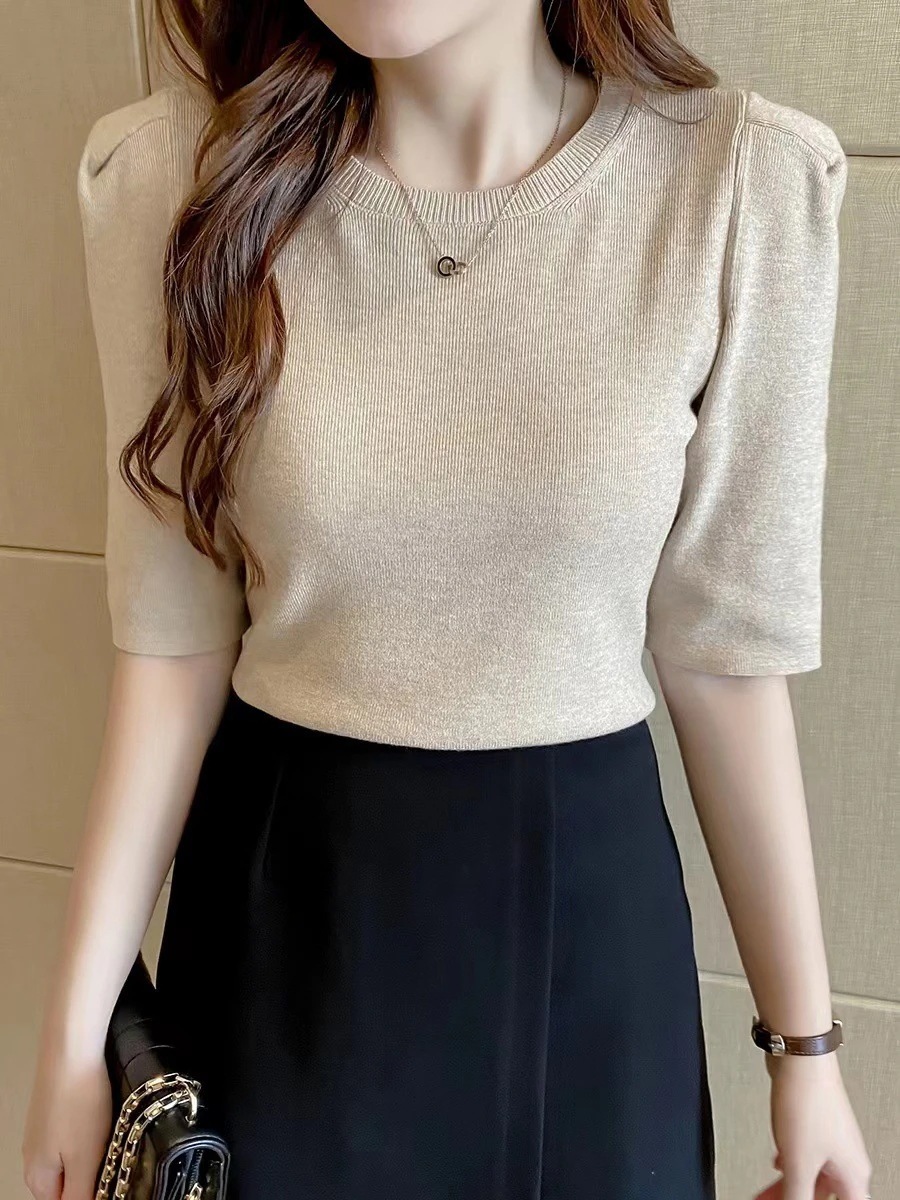 2024 夏 UVカットパワショル ニット レディース パワショルニット セーター クルーネック パフスリーブ トップス 五分袖 半袖 リブ タイト ボリューム袖 体型カバー ぽわん サマーニット