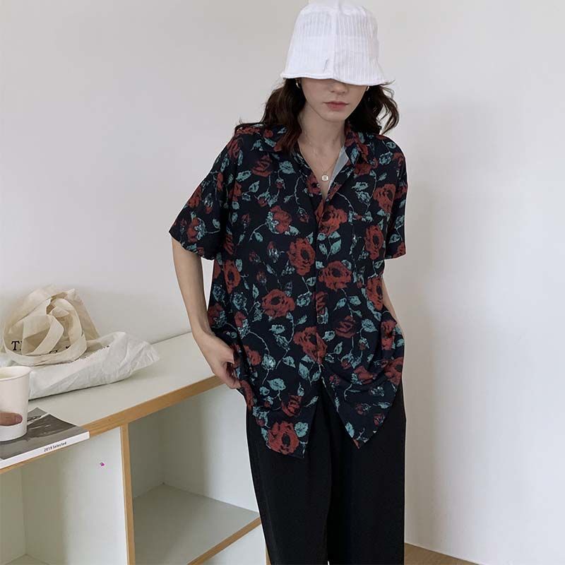 シャツ 韓国ファッション 新作ビーチ花柄半袖シャツ着痩せシャツ 半袖 レディース トップス シースルートップス ブラウス半袖Tシャツ