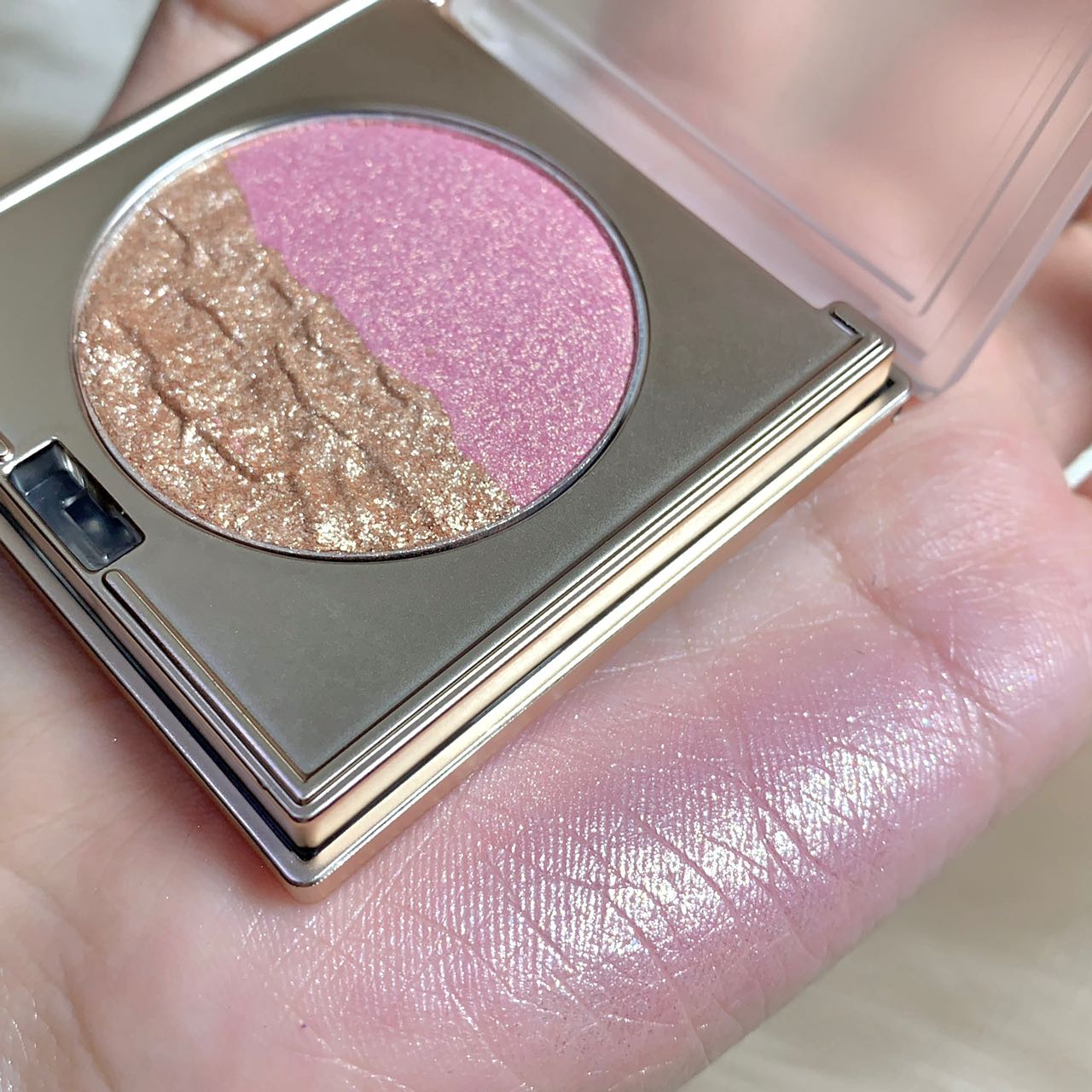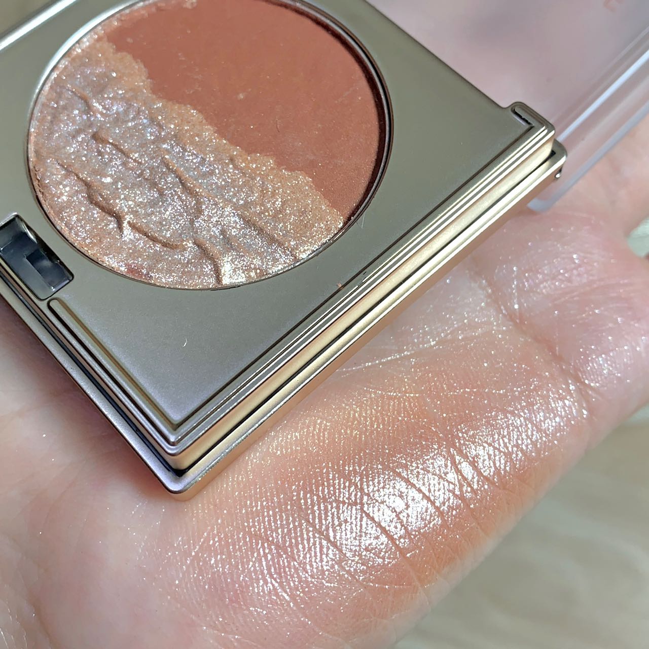 商品自体の実際の色味はオレンジ系かと思ったら赤っぽい。つけてみると薄づきで見た目はピンクのチークをつけた感じでした。キラキラ感はかわいいです。粉とびしやすいかな。乾燥肌の方にはむかないかも。