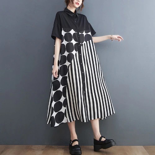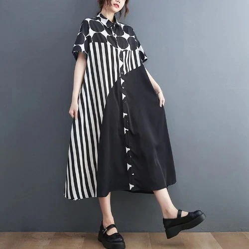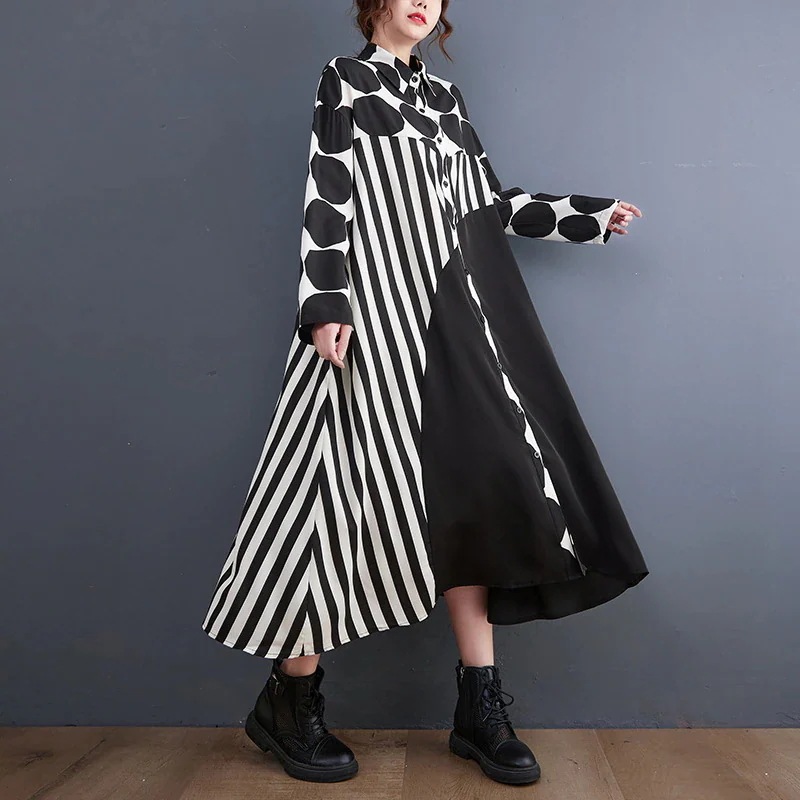2023長袖ブラウスシャツ ワンピースコントラストカラー大きめシャツワンピースファットマミー幾何黒&白