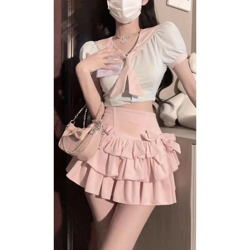 パーティードレスドレス ネイビーカラーシャツハイウエストリボンケーキハーフスカート2点セットドレス