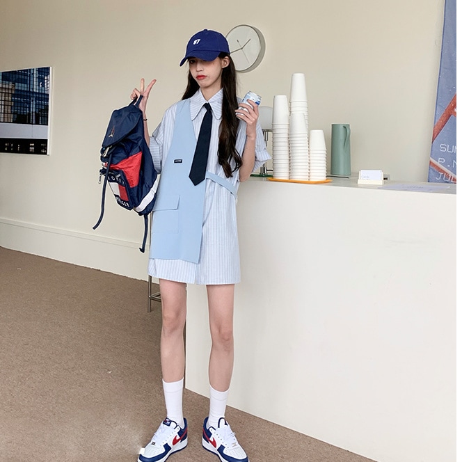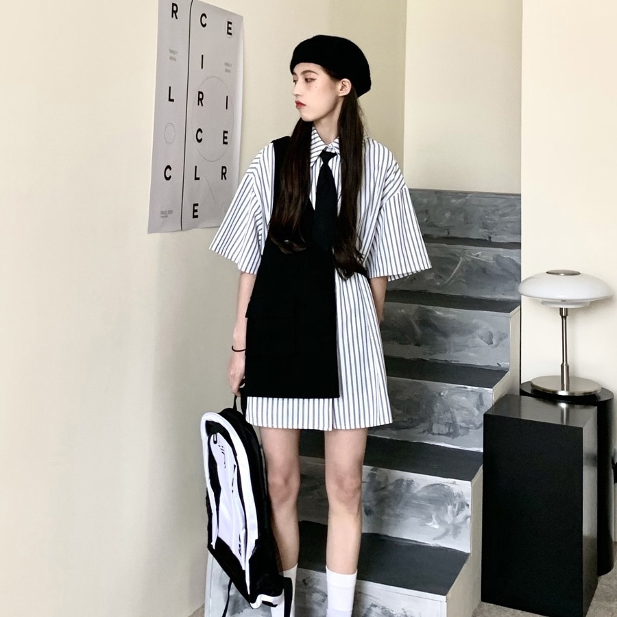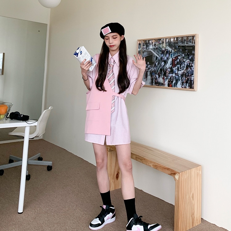 ファッションスーツ ベスト+半袖シャツワンピ 夏新作 イレギュラー ミディアムシャツ2点セット