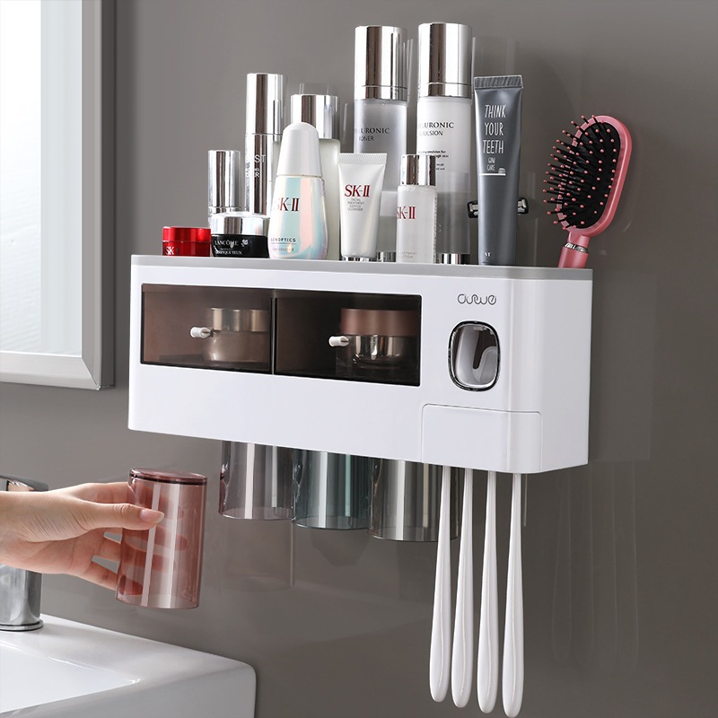 ASWEI歯ブラシホルダー 2コップ 3コップ 4コップ 壁掛け 歯ブラシスタンド 多機能 歯磨き粉ホルダー コップ棚 自動歯磨き粉ディスペンサー 洗面所 収納ラック 生活雑貨 取り付け簡単 穴開け不要