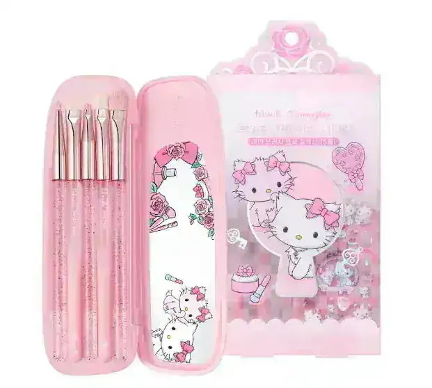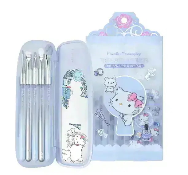 韓国では有名なfillimilliのアイメイクブラシセットに キティちゃんコラボが登場! 鏡付の薄型ケースにアイメイクブラシが5種類入っています 1-5の番号がブラシに書いてあってその順番通り使えばOKです