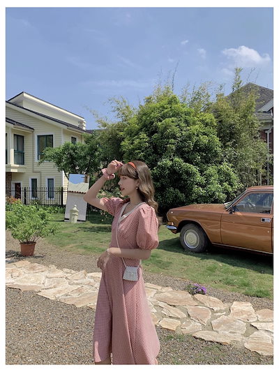 夏 スポット 韓国 チェック柄 レトロ 文学 ファン V ネック フレンチ ドレス 女性 ヘアリング 学生風 個性的 ワンピース 膝下 袖あり 半袖 パフスリーブ Vネック 襟なし かわいい
