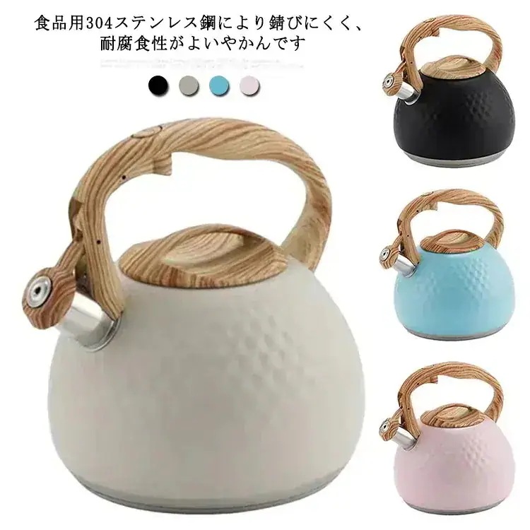 ケトル ステンレス 笛吹き やかん 3L 大容量 木目ハンドル 笛吹きケトル 湯沸かし ティーケトル 簡単開閉 コンパクト ガス火/IH対応 広口 キッチン用 オフィス 調理器具 おしゃれ 白