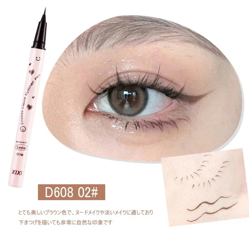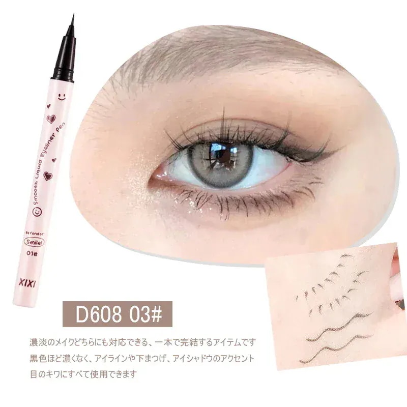 D608は手に書いたら結構滲んだけど、目元なら重ねて引けばにじみはよくわからなくなる。ただ乾くのが少し遅い印象。筆先が細いぶん短いから、意外と細く描けない。そして思ったより濃い。