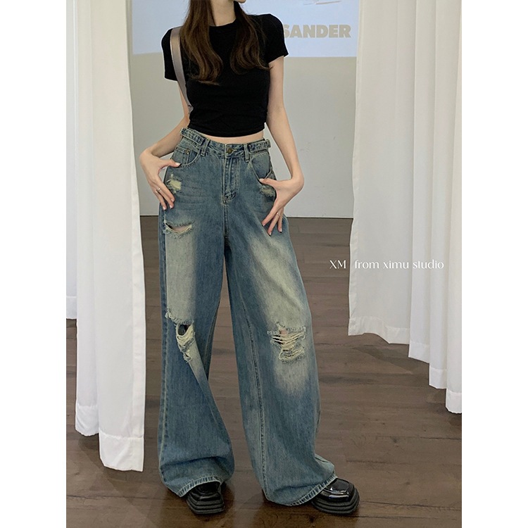 デニムボトムス アメリカンレト ロ穴あきストレートゆったり 2026春秋 ファッションオールマイティーハイウエスト で痩せ見え ジーンズ ボトムス レディース 美脚 デニムパンツ