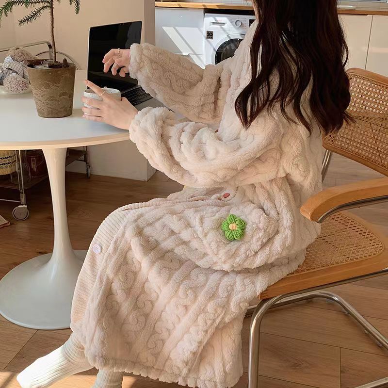ルームウェア 楽ちんルームウェア パジャマ 冬のパジャマ女性の秋と冬コーラルベルベットロングスイートフローラルパジャマプラスベルベット厚みのあるフードレスパジャマホームジャケット