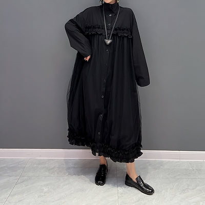 モード系スタンドカラー メッシュ レイヤード シャーリングヘム ロングシャツドレス 個性的なデザイン ステージ衣装 演出衣装 イベント こせい 個性 特徴あり 新作 TV 主演 ステージ衣装 モード系