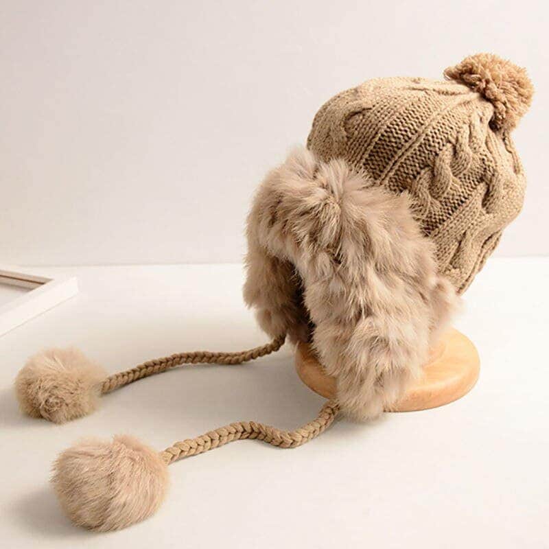 韩国のかわいいウールキャップ 帽子女性の秋と冬のイヤーマフ暖かい冬の雪のウールニット帽子ウサギの毛皮