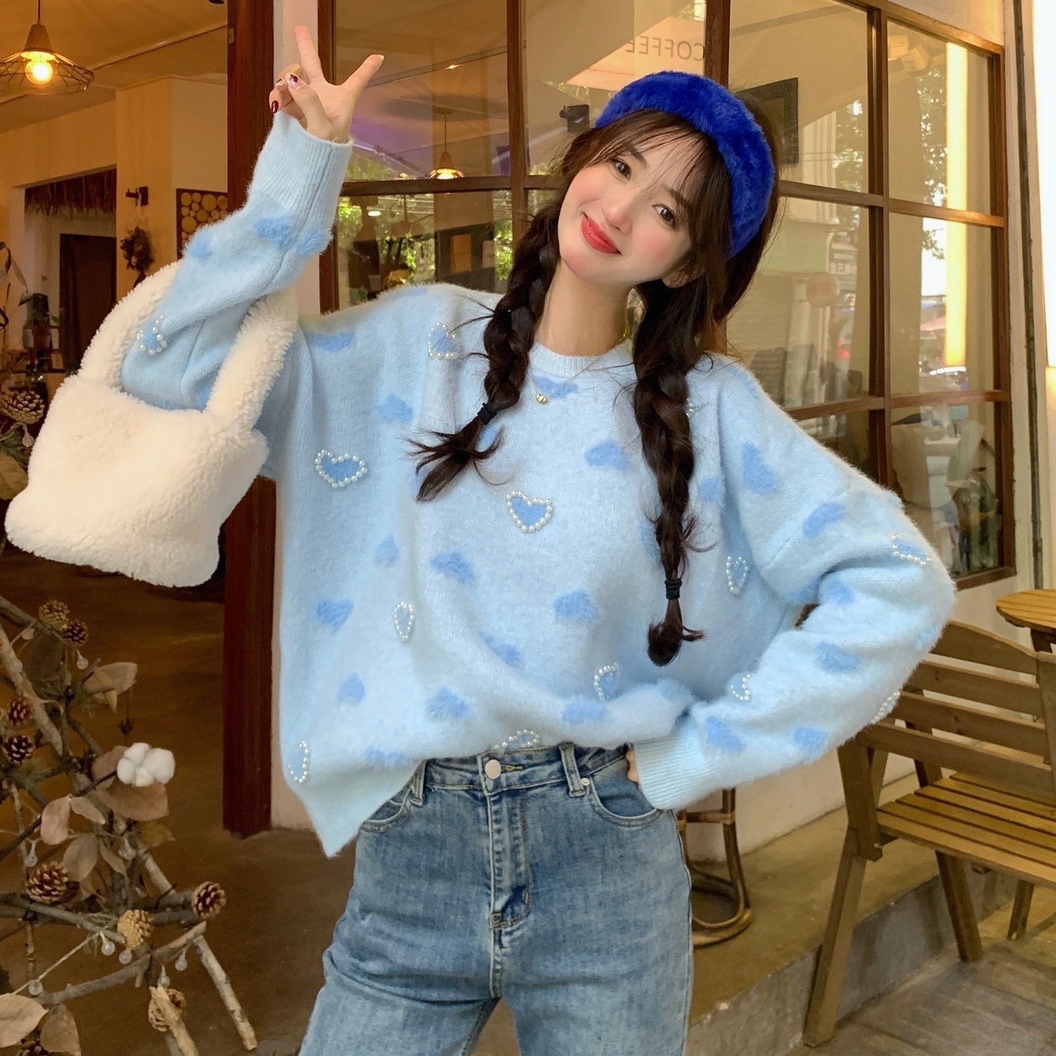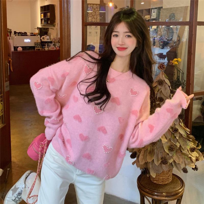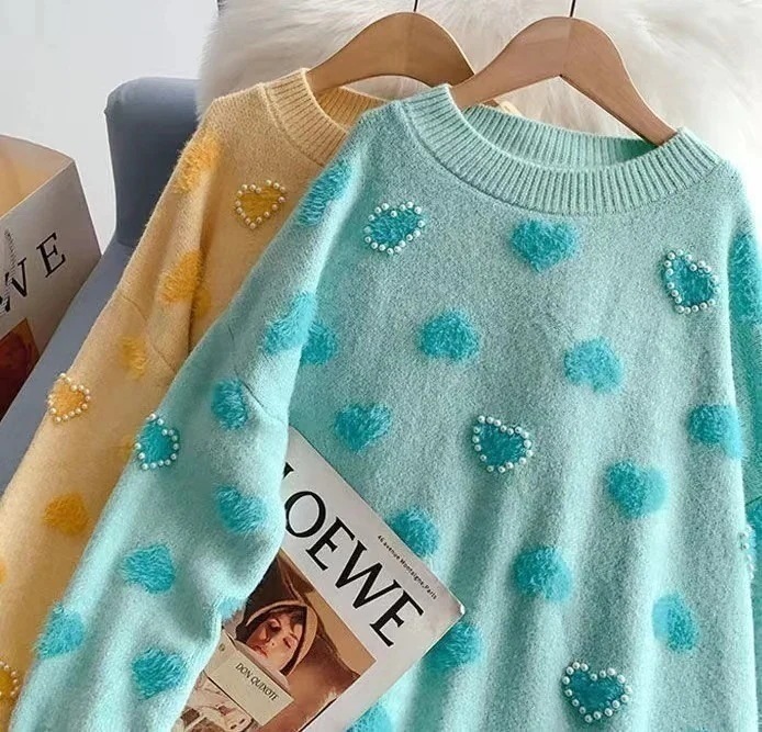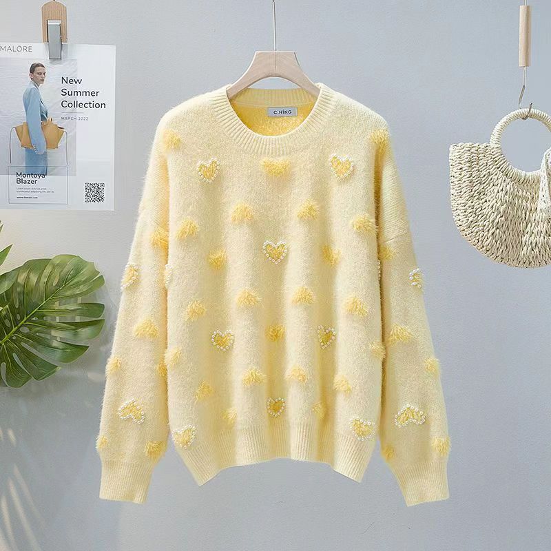イミテーションミンクベルベットビーズセーターレディース 2023 秋冬ルーズラウンドネックスウィートハートセーターレディーストップス