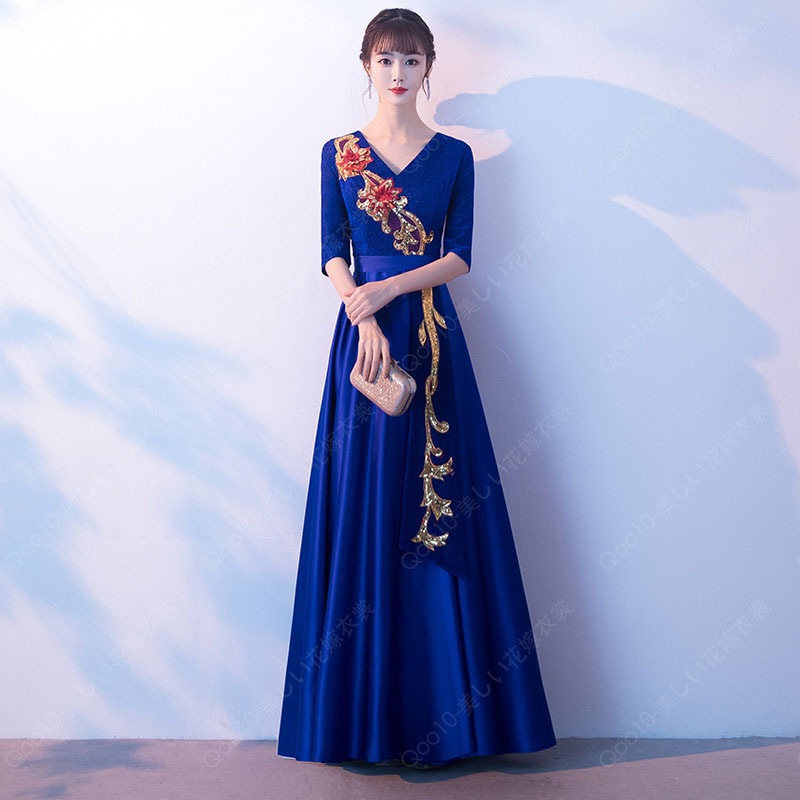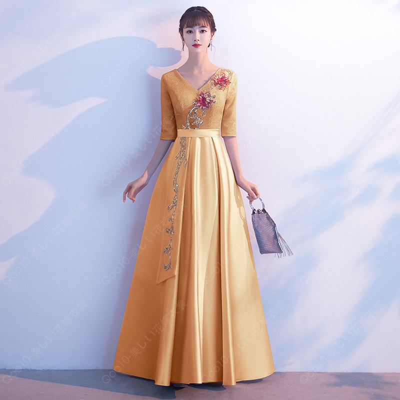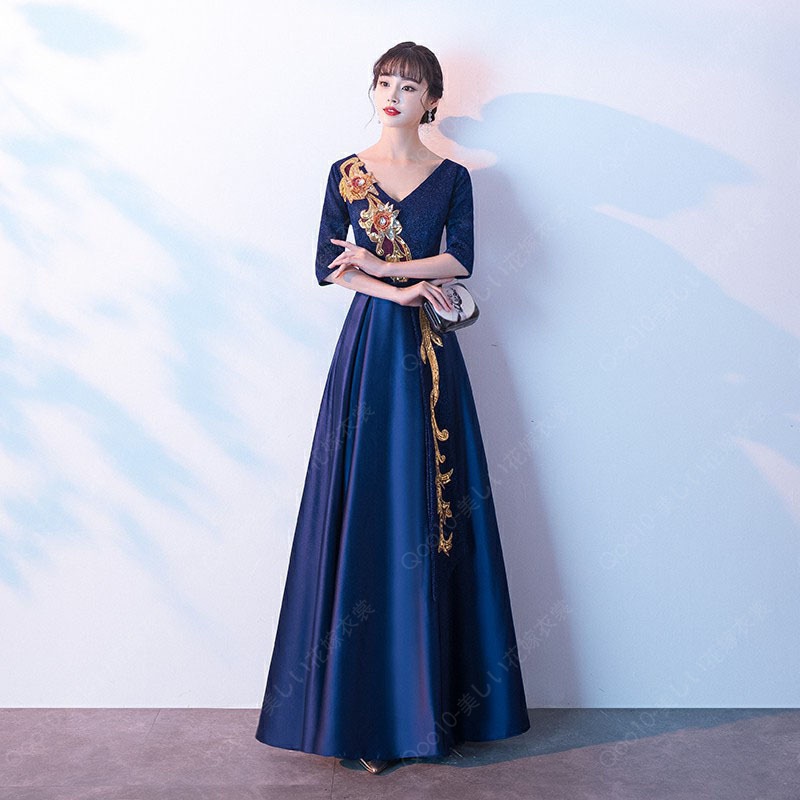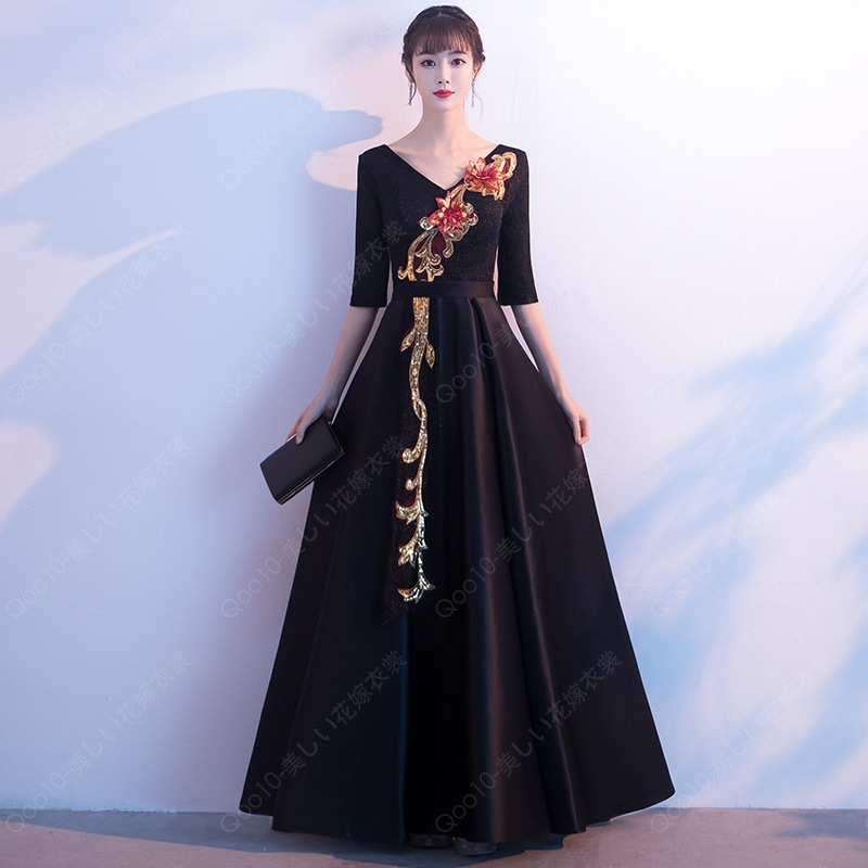 ロングドレス 演奏会 黒 ドレス パーティードレス 大きいサイズ 袖あり 袖付き 発表会 パーティードレス ステージ用 衣装 カラードレス Aライン ファスナー 厚サ-39